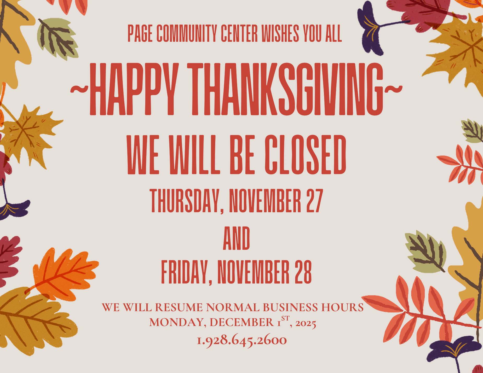 Thanksgiving Closure Location Page Community Center 699 S. Navajo Dr., Page AZ, 86040 Date November 27, 2025 Time This is an all day event Department Community Center Category Holidays Description We wish all a very Happy Thanksgiving... |