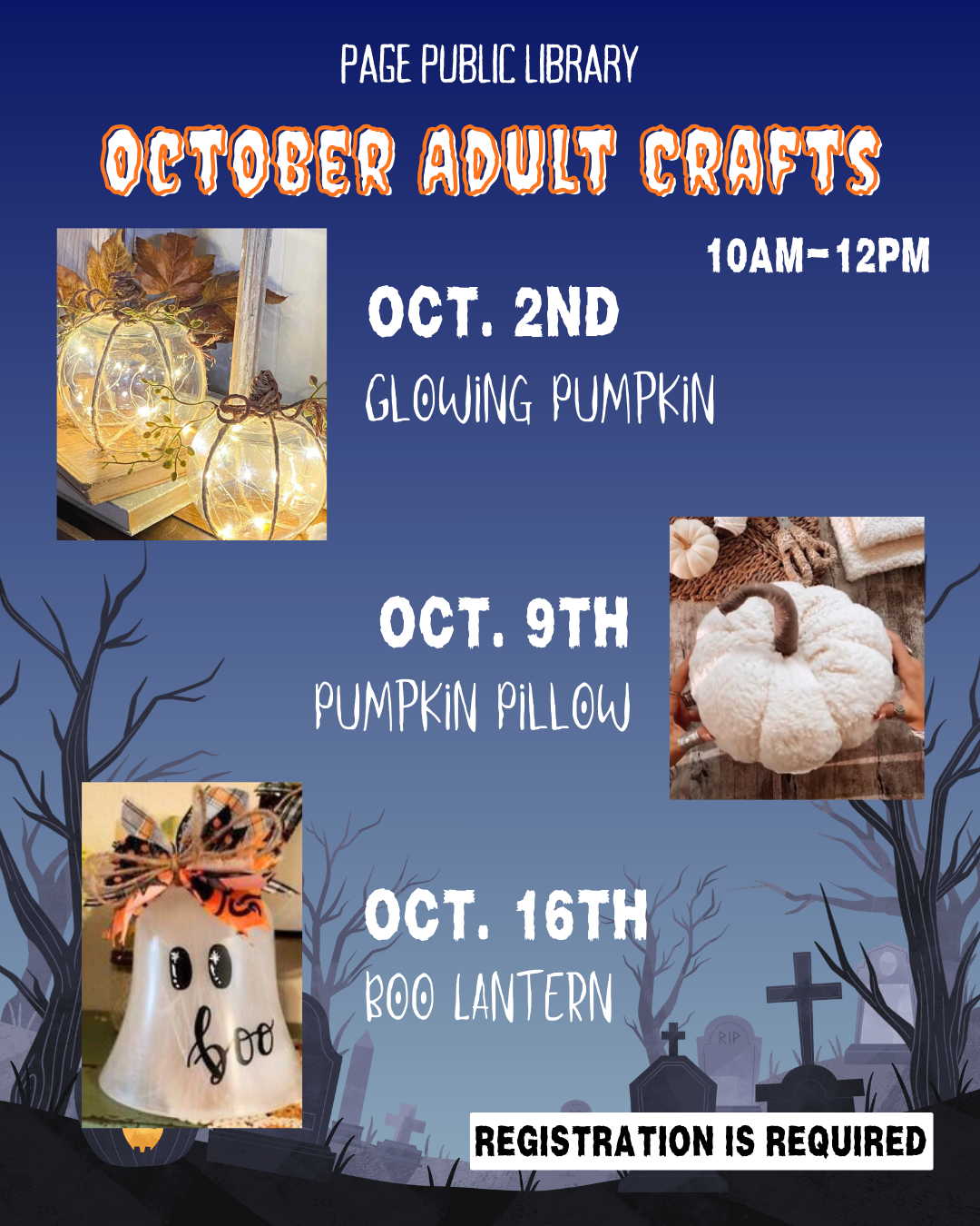 Adult Craft: Pillow Pumpkins Location Page Public Library 479 S. Lake Powell Blvd., Page AZ, 86040 Date October 09, 2025 Time 10:00 AM to 12:00 PM Department Page Public Library Category Adult's Calendar Description Registration is required. |