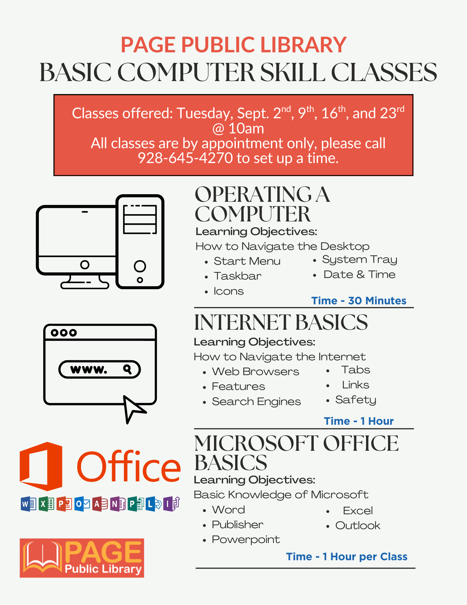 Computer Classes Location Page Public Library 479 S. Lake Powell Blvd., Page AZ, 86040 Date October 21, 2025 Time 10:00 AM to 11:00 AM Repeat Weekly Department Page Public Library Category Adult's Calendar Description Call to schedule an appointment. |