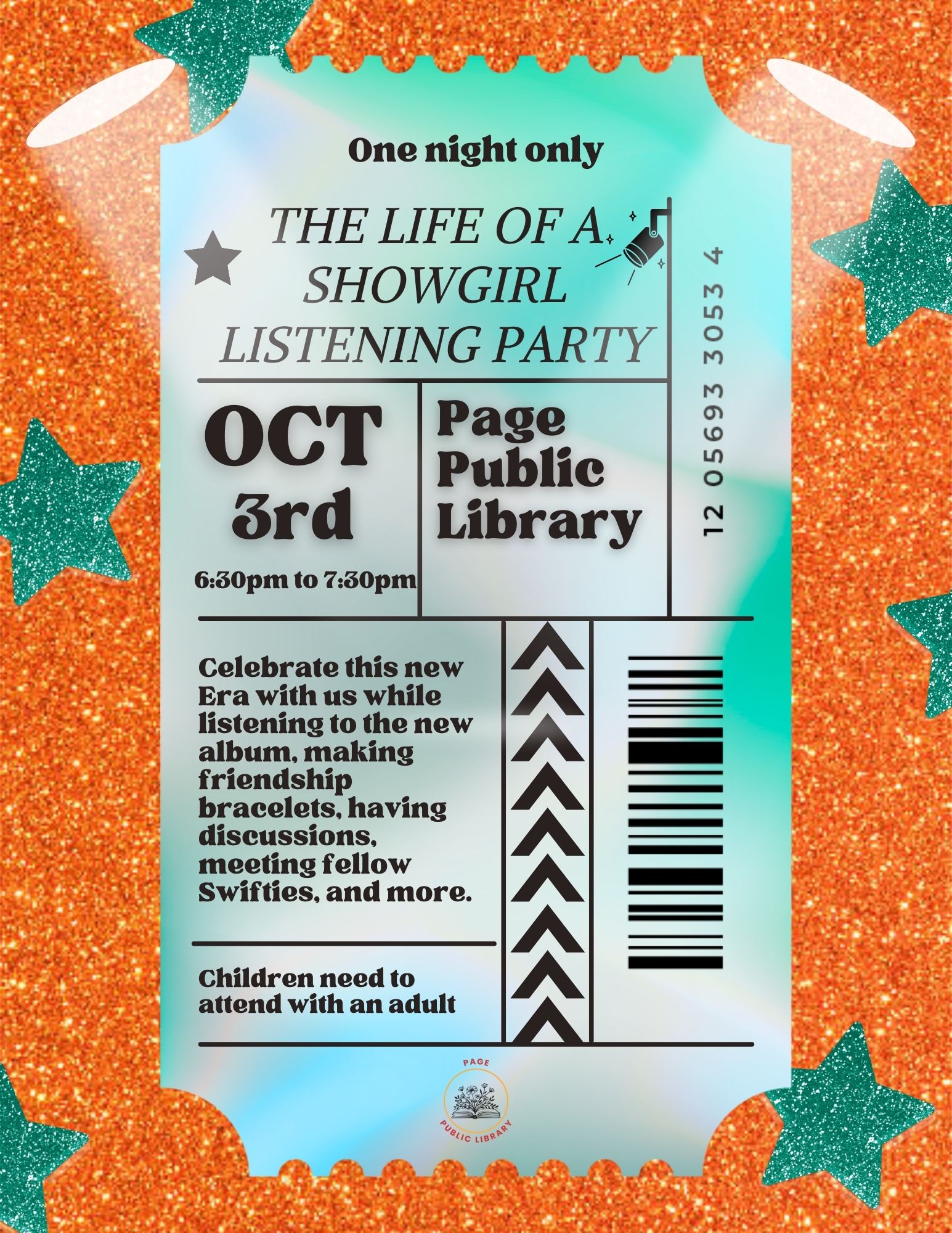 Taylor Swift Album Listening Party Location Page Public Library 479 S. Lake Powell Blvd., Page AZ, 86040 Date October 03, 2025 Time 6:30 PM to 7:30 PM Department Page Public Library Category All Ages Welcome Description Children must be accompanied by an adult. |