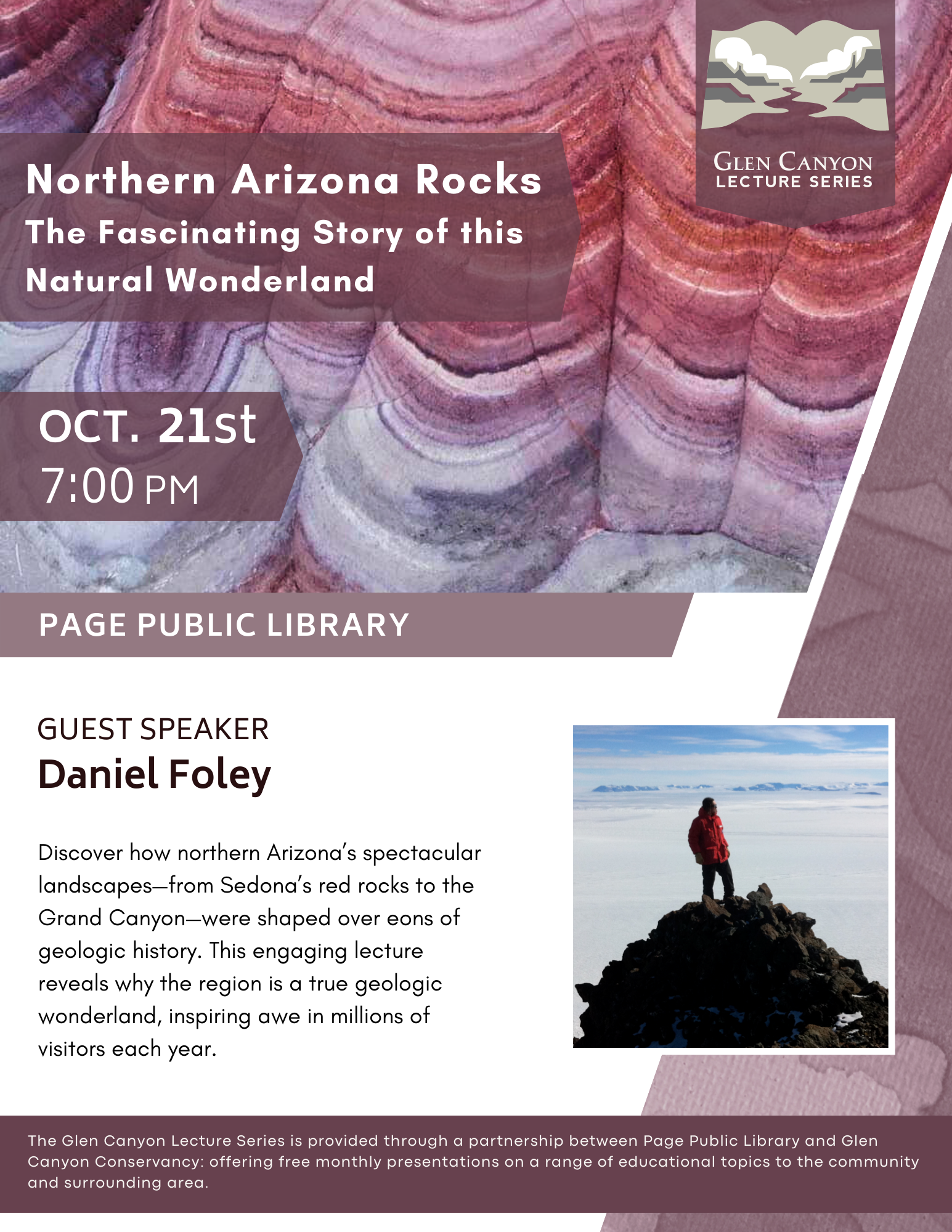 Glen Canyon Lecture Series Location Page Public Library 479 S. Lake Powell Blvd., Page AZ, 86040 Date October 21, 2025 Time 7:00 PM to 8:00 PM Department Page Public Library Category Miscellaneous Description |