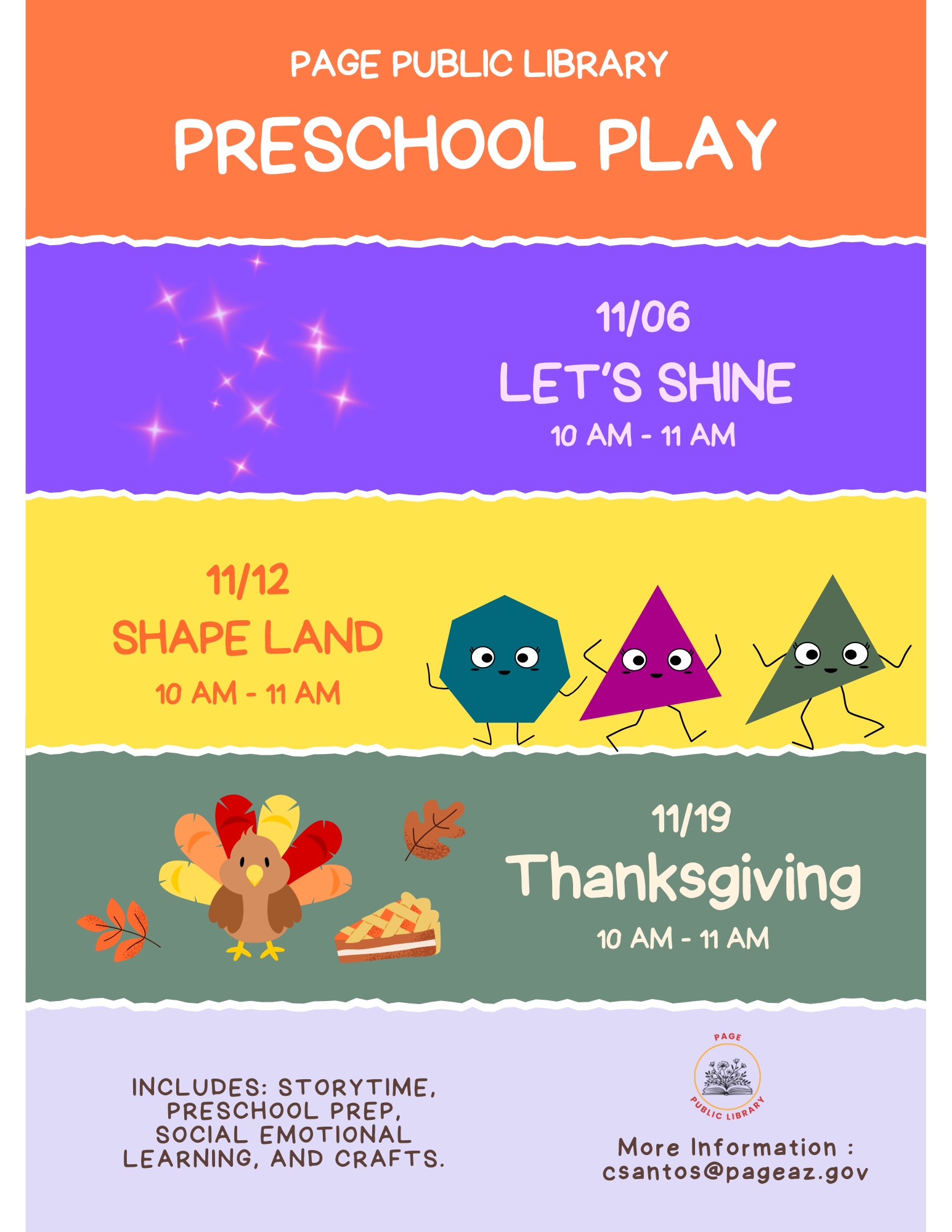 Preschool Play Location Page Public Library 479 S. Lake Powell Blvd., Page AZ, 86040 Date November 19, 2025 Time 10:00 AM to 11:00 AM Repeat Weekly Department Page Public Library Category Children's Calendar Description Ages 3-5. |