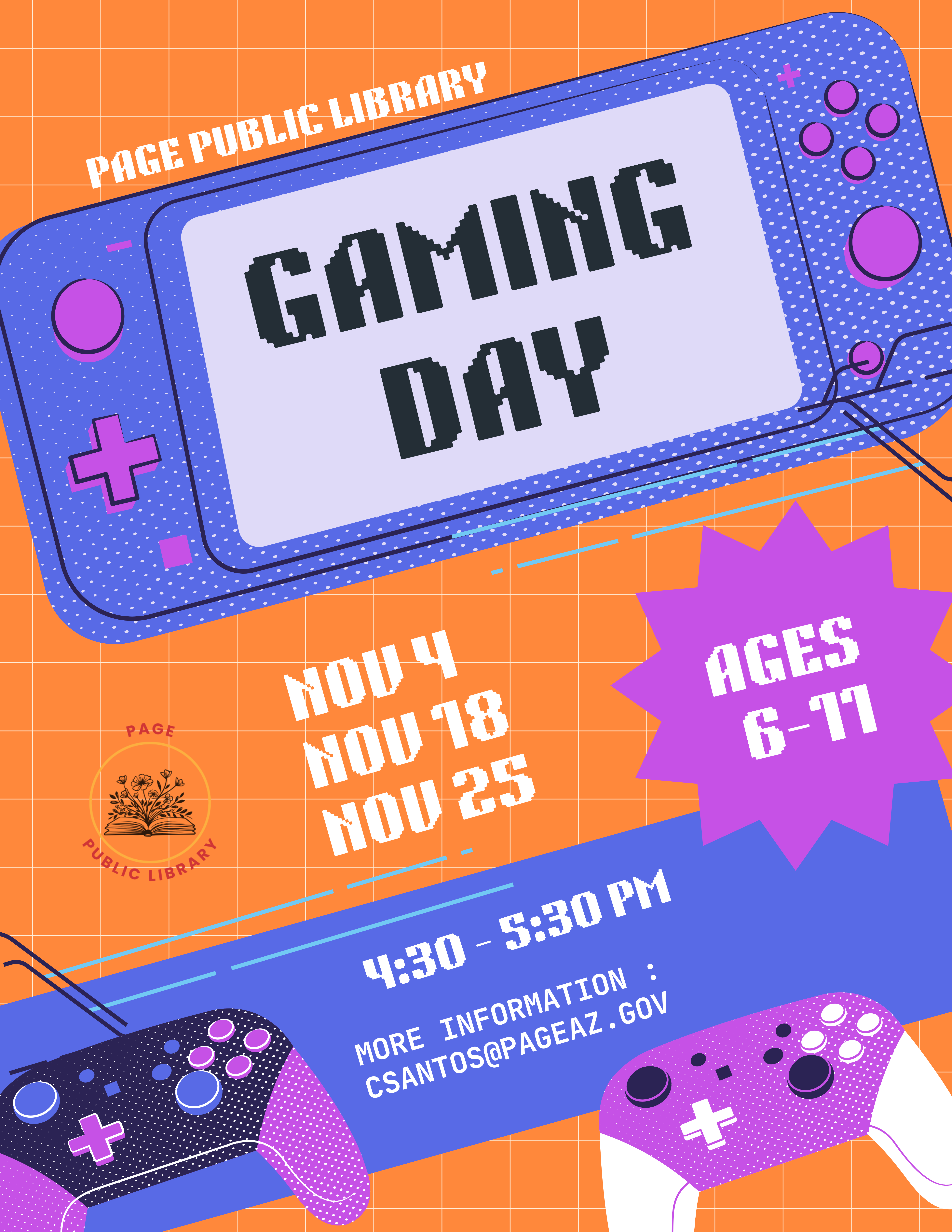 Gaming Day Location Page Public Library 479 S. Lake Powell Blvd., Page AZ, 86040 Date November 18, 2025 Time 4:30 PM to 5:30 PM Repeat Weekly Department Page Public Library Category After School Program Description |