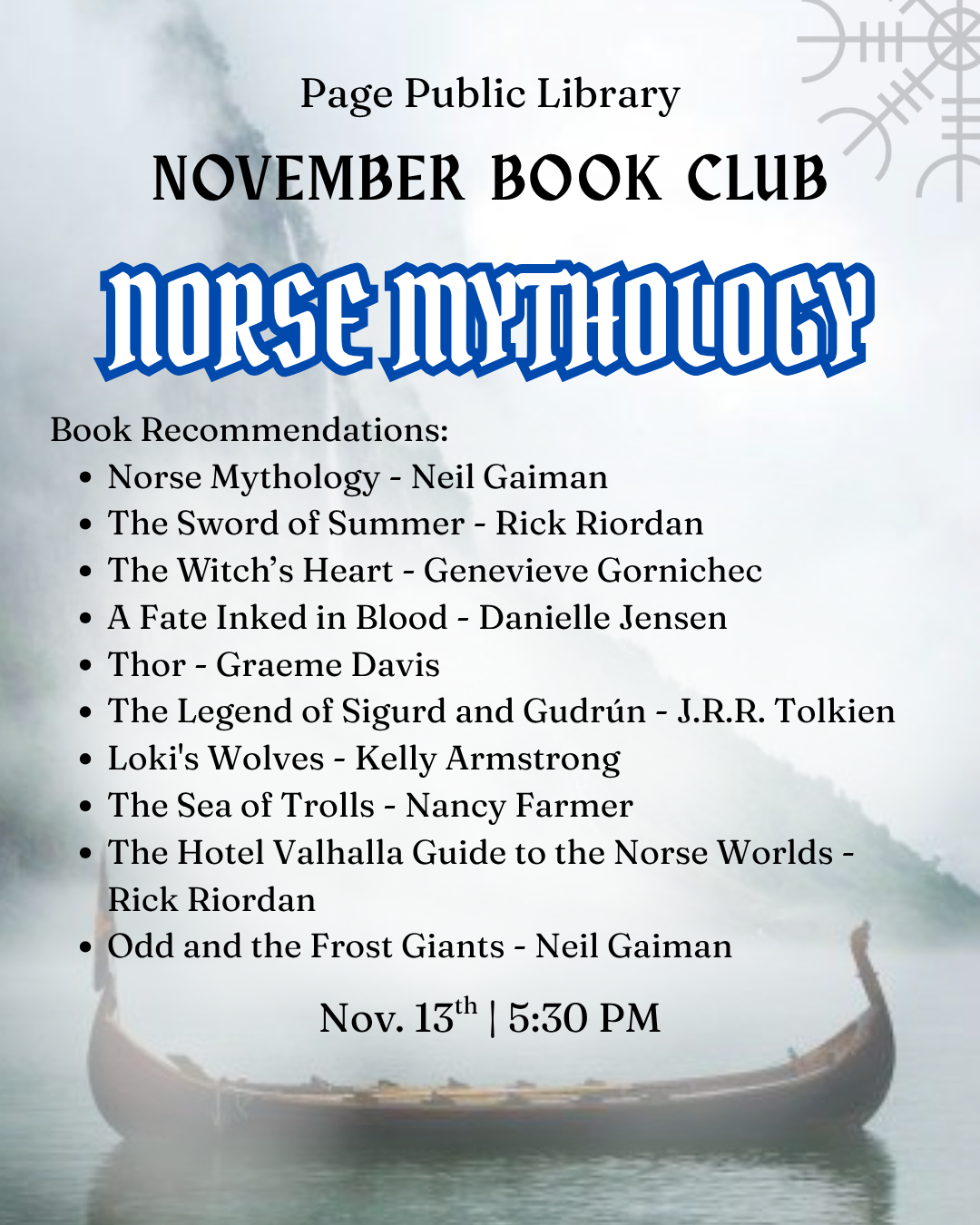 Book Club: Norse Location Page Public Library 479 S. Lake Powell Blvd., Page AZ, 86040 Date November 13, 2025 Time 5:30 PM to 6:30 PM Department Page Public Library Category Adult's Calendar Description |