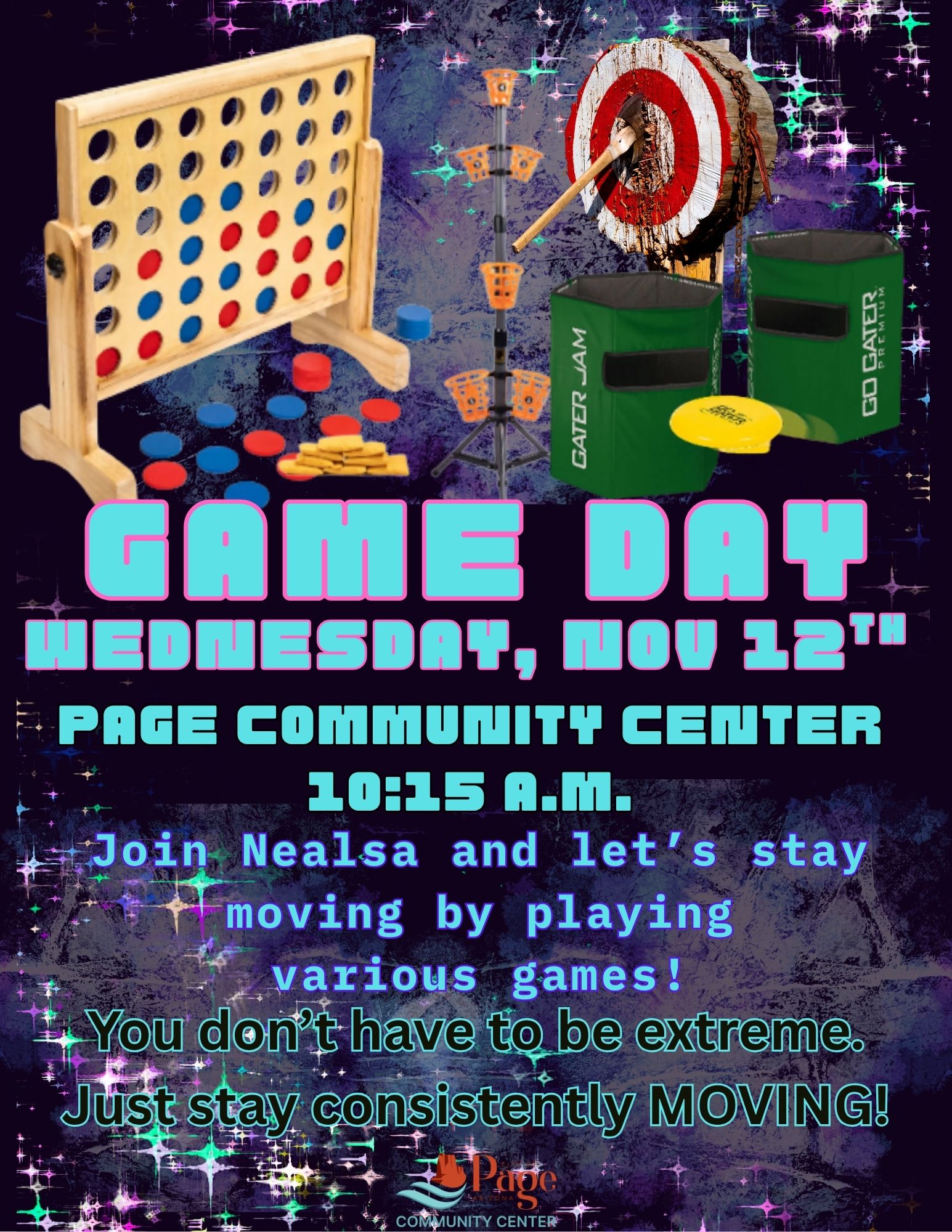 Game Day with Nealsa Location Page Community Center 699 S. Navajo Dr., Page AZ, 86040 Date November 12, 2025 Time 10:15 AM to 11:30 AM Department Community Center Category Staying Active Description Various games will be provided to keep you moving.... |