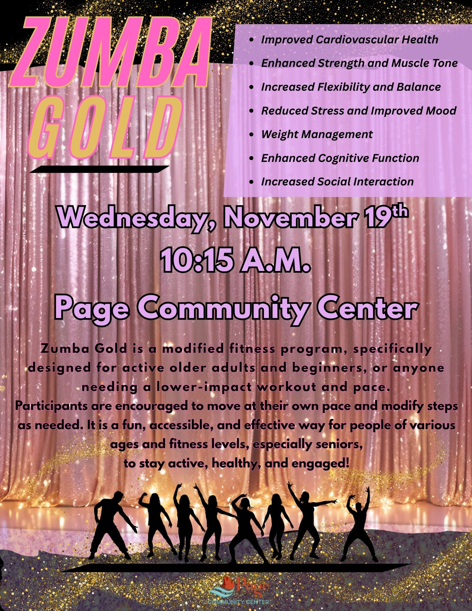 Zumba Gold Location Page Community Center 699 S. Navajo Dr., Page AZ, 86040 Date November 19, 2025 Time 10:15 AM to 11:30 AM Department Community Center Category Staying Active Description Zumba Gold is back.... Don't wait to start moving! Come check out what Zumba Gold really is before deciding it's not for you. ;) Hope to see you there!!!! |