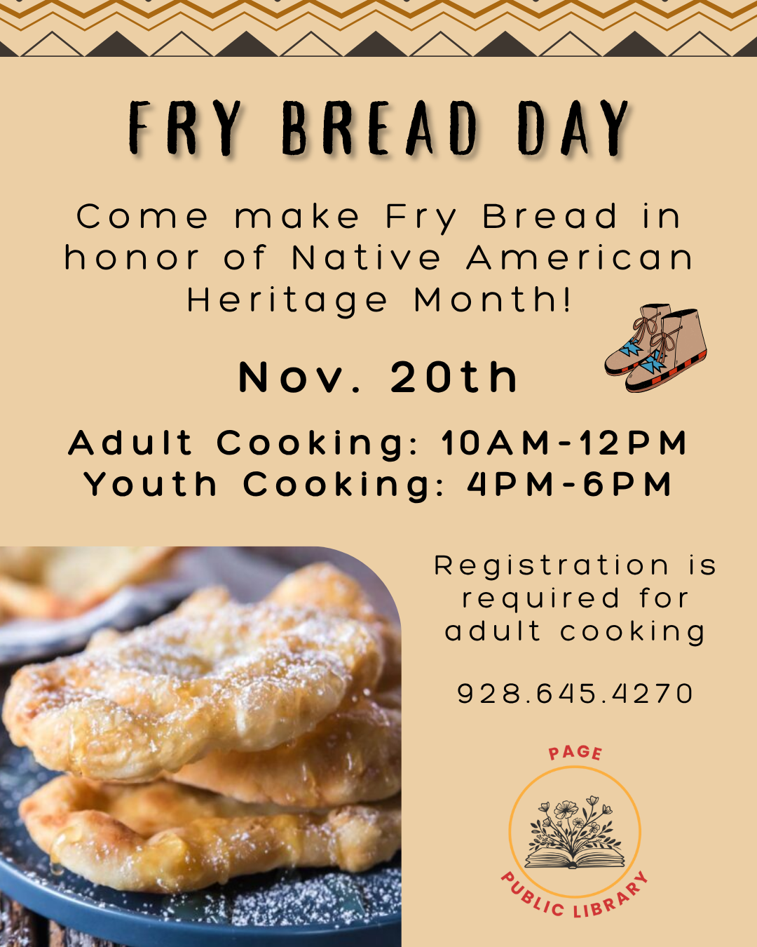 Fry Bread Day Location Page Public Library 479 S. Lake Powell Blvd., Page AZ, 86040 Date November 20, 2025 Time 10:00 AM to 12:00 PM Department Page Public Library Category Adult's Calendar Description Registration is required. |