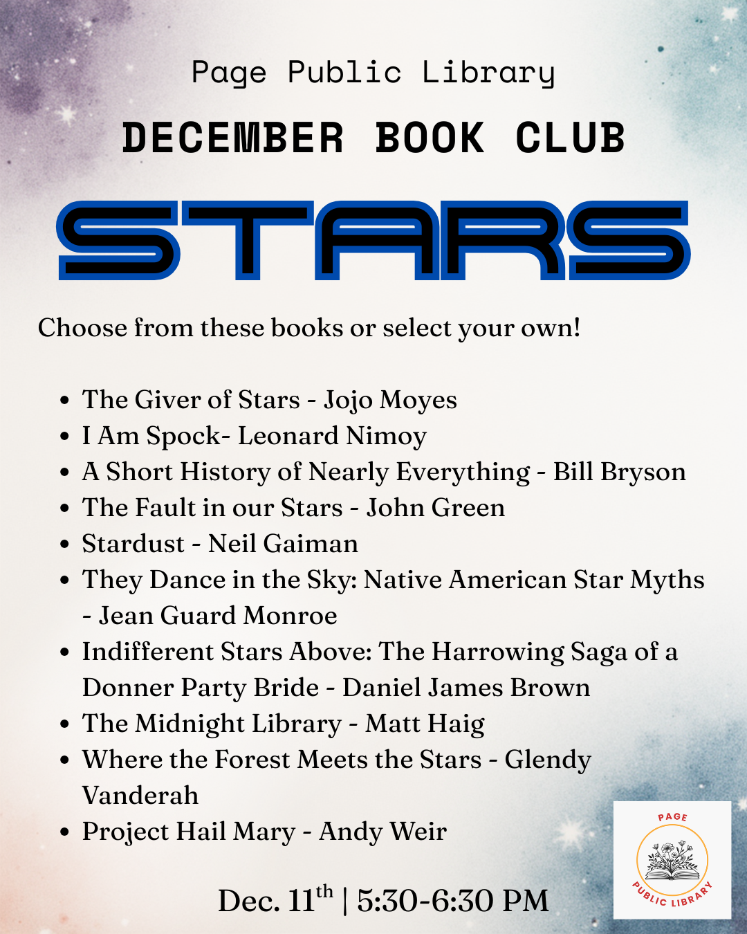 Adult Book Club Location Page Public Library 479 S. Lake Powell Blvd., Page AZ, 86040 Date December 11, 2025 Time 5:30 PM to 6:30 PM Department Page Public Library Category Adult's Calendar Description |