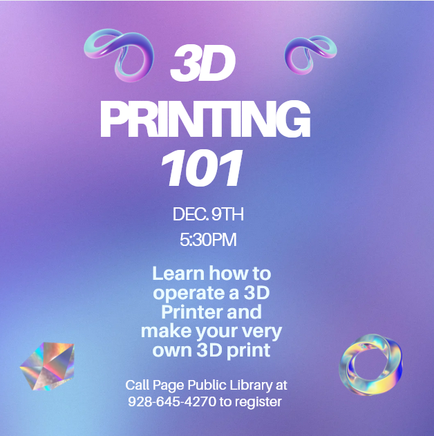 3D Printing 101 Location Page Public Library 479 S. Lake Powell Blvd., Page AZ, 86040 Date December 09, 2025 Time 5:30 PM to 7:00 PM Department Page Public Library Category Adult's Calendar Description Registration required. Call (928) 645-4270 to claim your seat. |