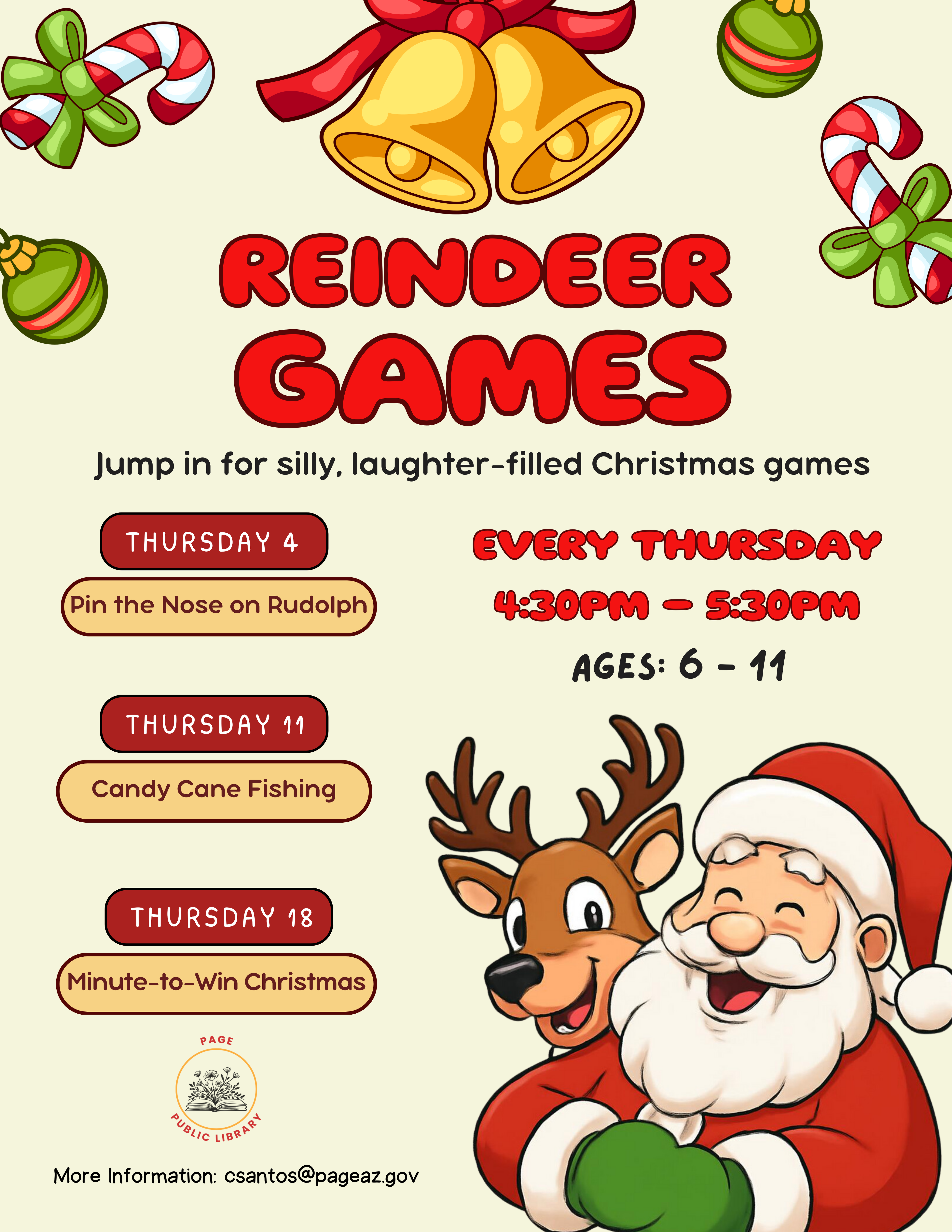 Children - Pin the Nose on Rudolph Location Page Public Library 479 S. Lake Powell Blvd., Page AZ, 86040 Date December 04, 2025 Time 4:30 PM to 5:30 PM Department Page Public Library Category Children's Calendar Description |