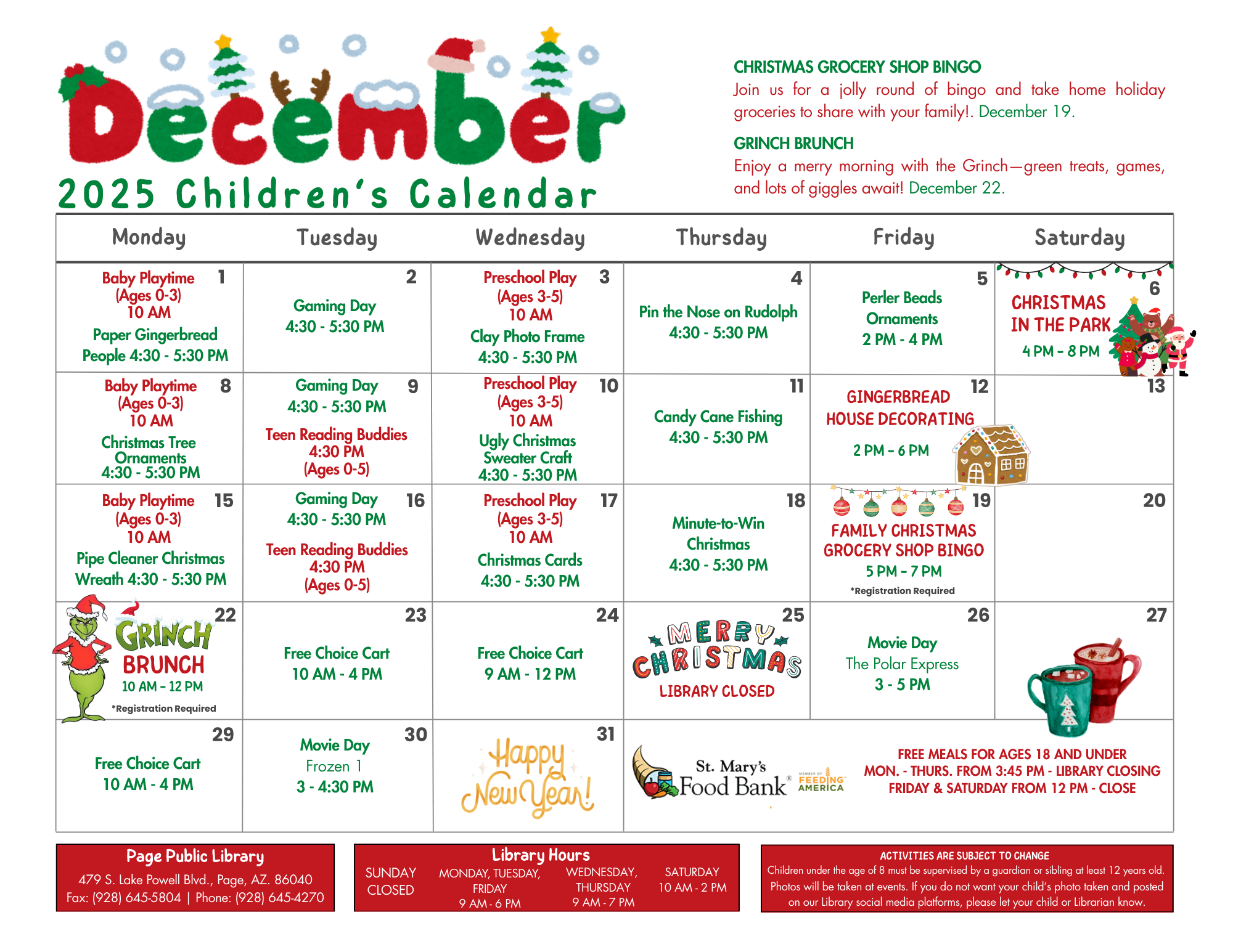 Children - Minute-to-Win Christmas Location Page Public Library 479 S. Lake Powell Blvd., Page AZ, 86040 Date December 18, 2025 Time 4:30 PM to 5:30 PM Department Page Public Library Category Children's Calendar Description |