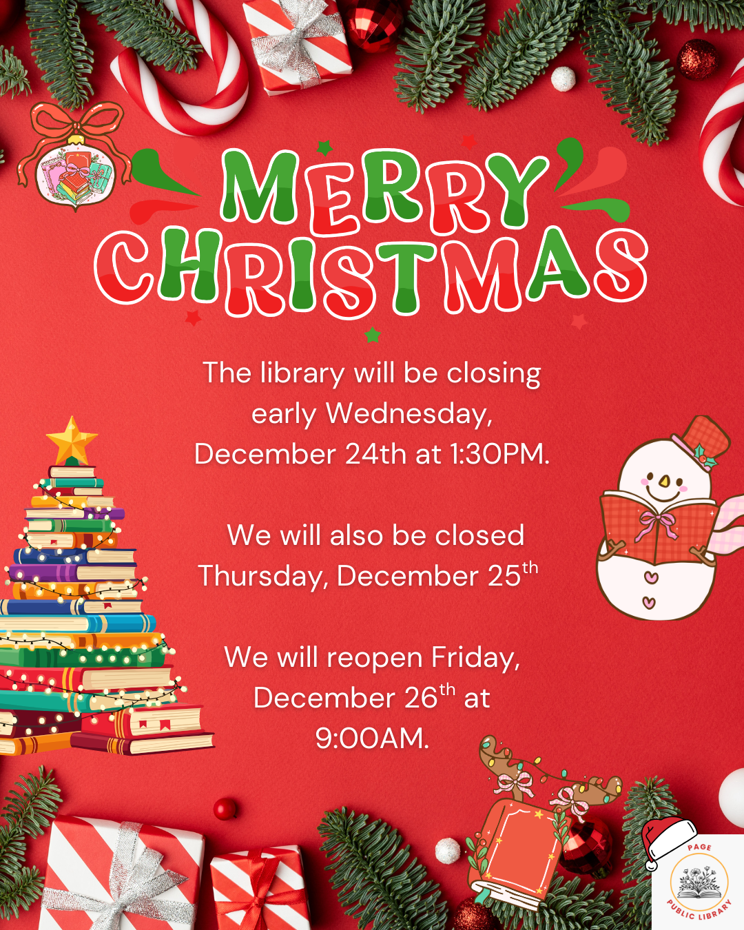 Library Closing Early Location Page Public Library 479 S. Lake Powell Blvd., Page AZ, 86040 Date December 24, 2025 Time This is an all day event Department Page Public Library Category All Ages Welcome Description |