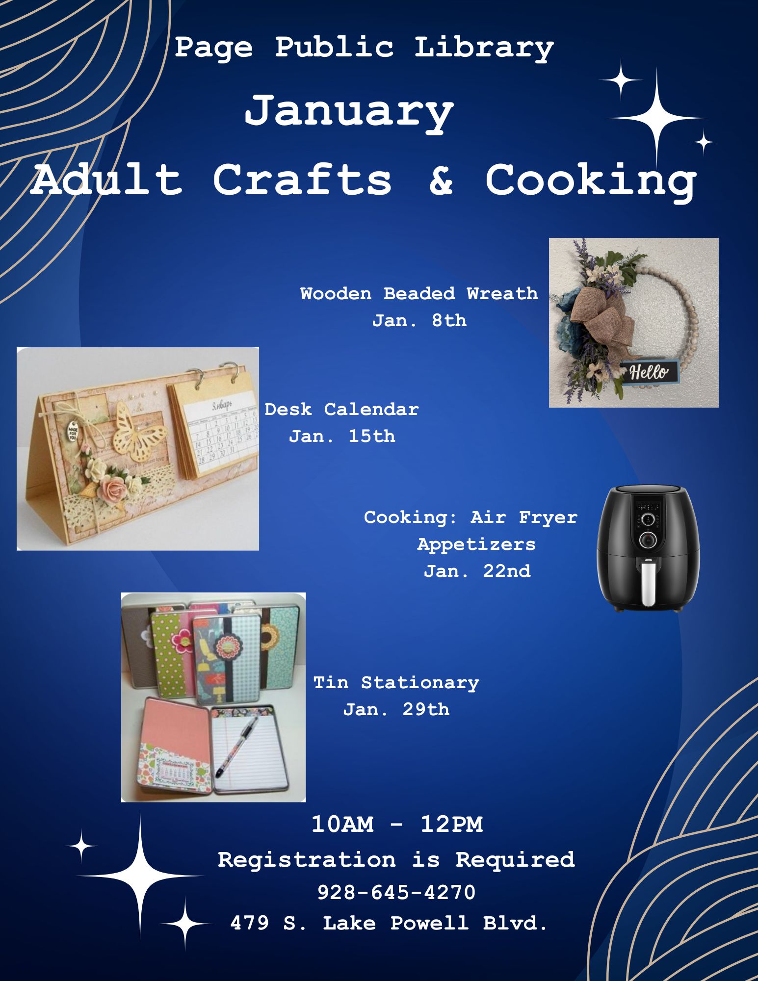 Adult Cooking - Air Fryer Appetizers Location Page Public Library 479 S. Lake Powell Blvd., Page AZ, 86040 Date January 22, 2026 Time 10:00 AM to 12:00 PM Department Page Public Library Category Adult's Calendar Description |
