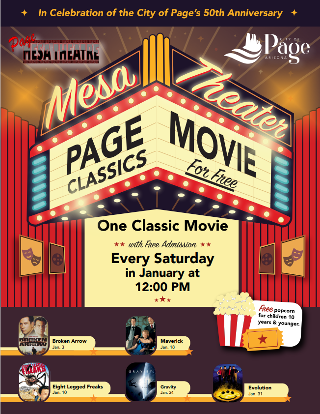 Page Classics at the Mesa Theatre Location Mesa Theater 42 S. Lake Powell Blvd. Phone: 928-645-9565 Date January 10, 2026 Time 12:00 PM to 3:00 PM Department Special Events Description Continue the celebration of the City of Page’s 50th Anniversary with free classic movies at the historic Mesa Theatre located on 42 S. Lake Powell Blvd. Movie lovers of all ages are invited to enjoy Free Page Classics every Saturday in January at 12:00 pm, featuring favorite films that were filmed right here in Page. Featured movies include: