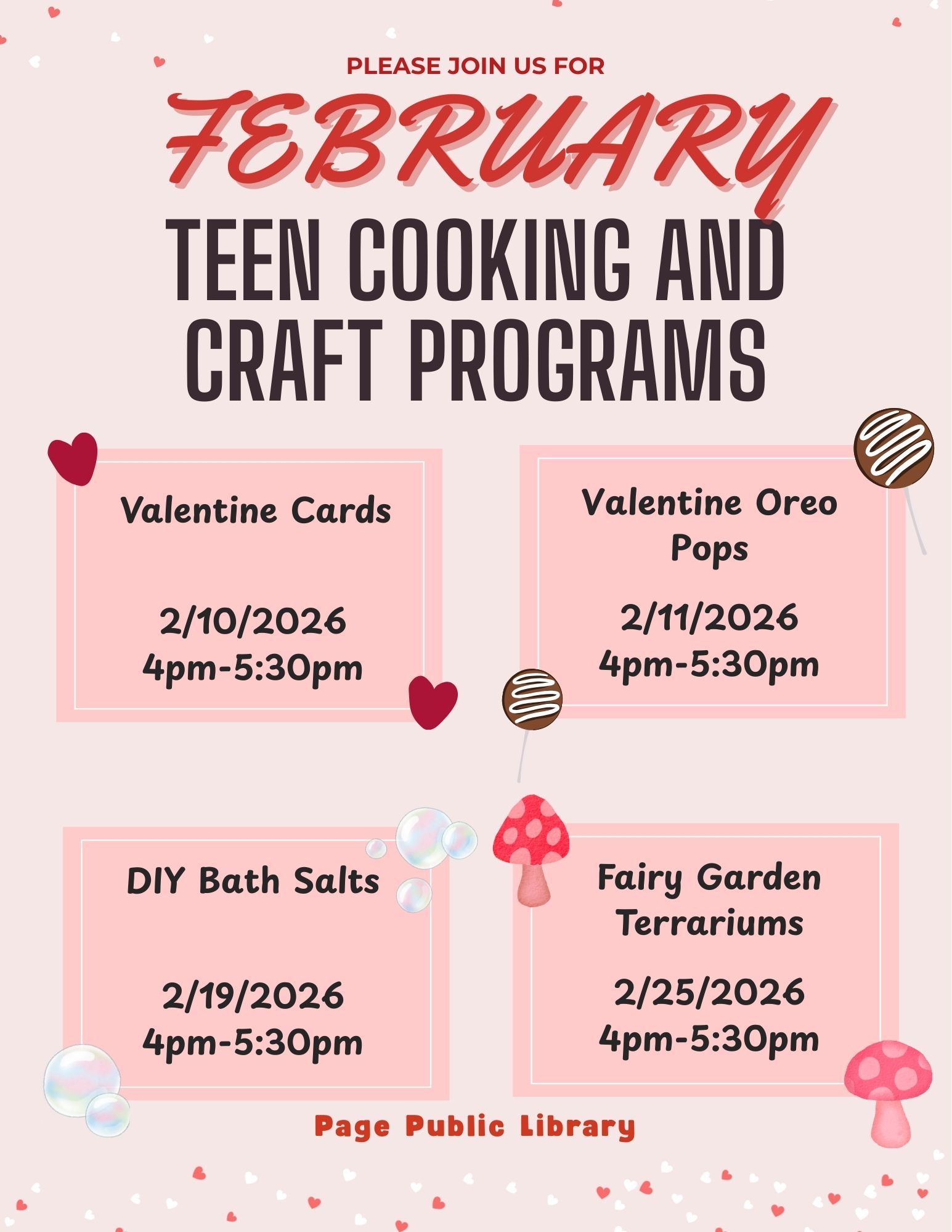 Teens - DIY Bath Salts Location Page Public Library 479 S. Lake Powell Blvd., Page AZ, 86040 Date February 19, 2026 Time 4:00 PM to 5:30 PM Department Page Public Library Category Teen's Calendar Description |