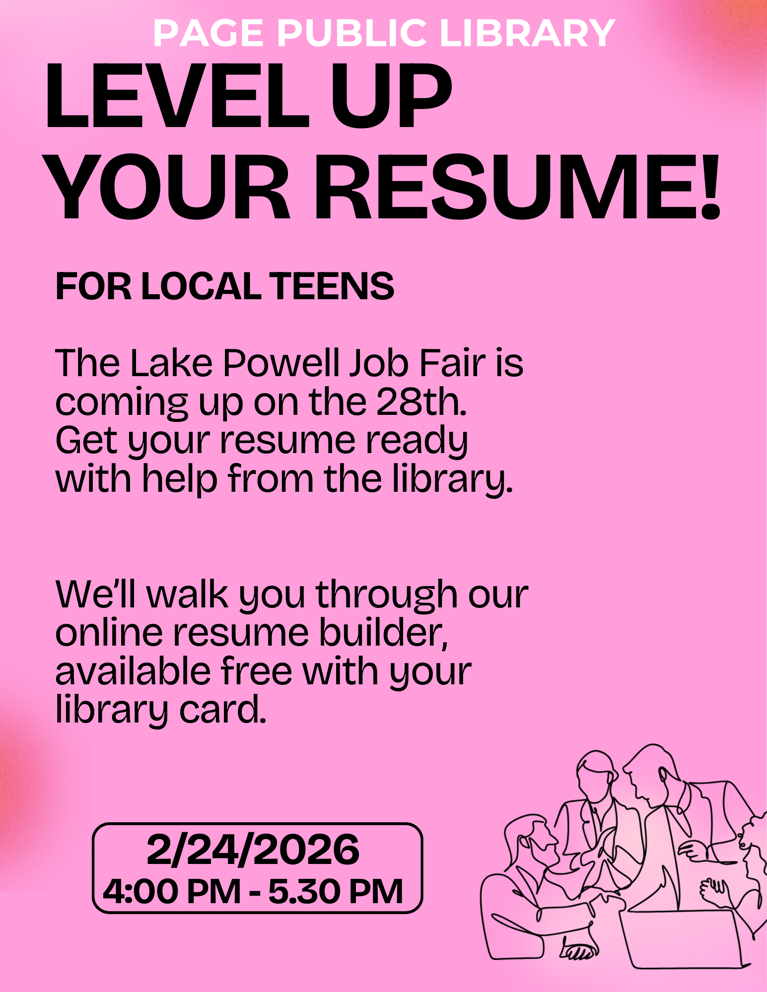 Teens - Level Up Your Resume Location Page Public Library 479 S. Lake Powell Blvd., Page AZ, 86040 Date February 24, 2026 Time 4:00 PM to 5:30 PM Department Page Public Library Category Teen's Calendar Description |