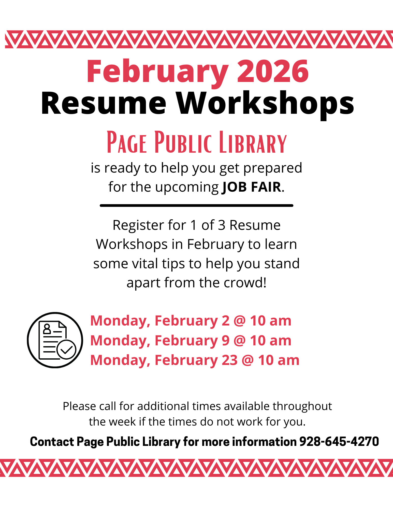 Adult's - Resume Workshop Location Page Public Library 479 S. Lake Powell Blvd., Page AZ, 86040 Date February 23, 2026 Time 10:00 AM to 11:00 AM Department Page Public Library Category Adult's Calendar Description |