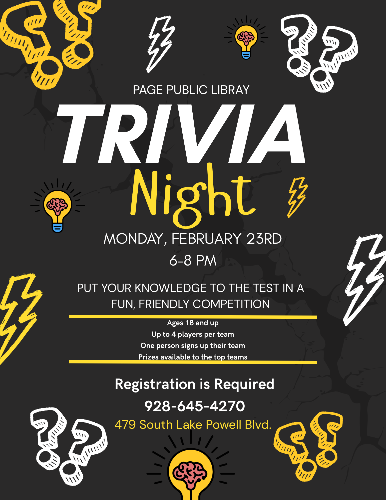 Adult After Hours: Trivia Night Location Page Public Library 479 S. Lake Powell Blvd., Page AZ, 86040 Date February 23, 2026 Time 6:00 PM to 8:00 PM Department Page Public Library Category Adult's Calendar Description |