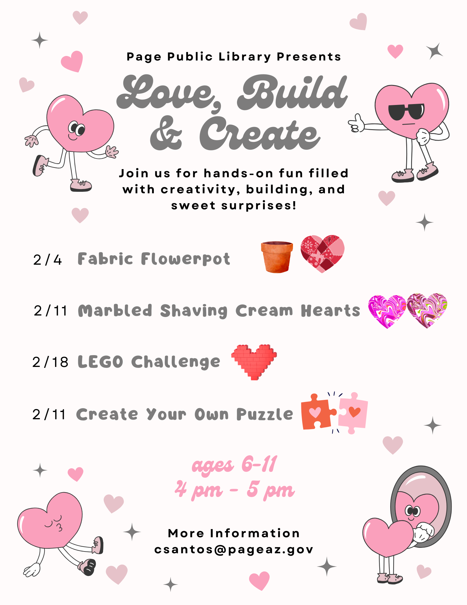 Children's After School Program - LEGO Challenge Location Page Public Library 479 S. Lake Powell Blvd., Page AZ, 86040 Date February 18, 2026 Time 4:00 PM to 5:00 PM Department Page Public Library Category Children's Calendar Description |