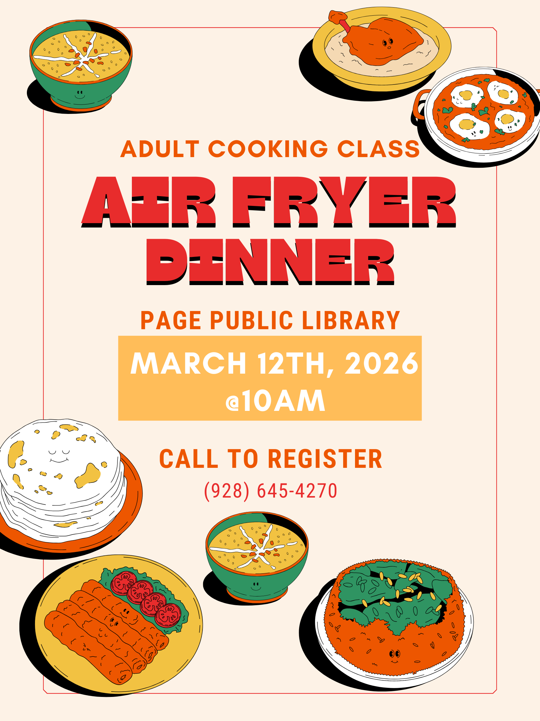 Adult's - Air Fryer Dinner Class Location Page Public Library 479 S. Lake Powell Blvd., Page AZ, 86040 Date March 12, 2026 Time 10:00 AM to 2:00 PM Department Page Public Library Category Adult's Calendar Description |