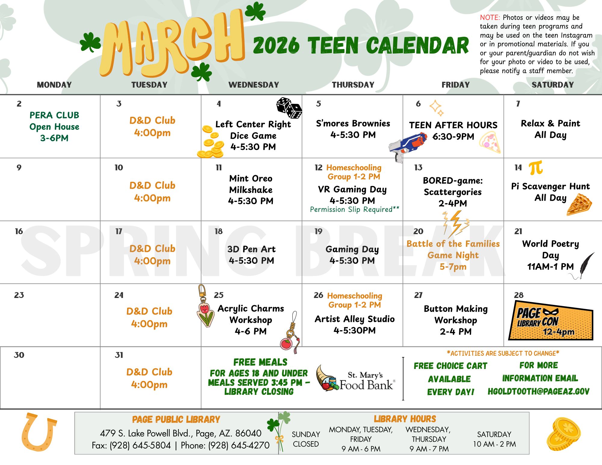 Teen's - Homeschooling Group Location Page Public Library 479 S. Lake Powell Blvd., Page AZ, 86040 Date March 12, 2026 Time 1:00 PM to 2:00 PM Department Page Public Library Category Teen's Calendar Description |