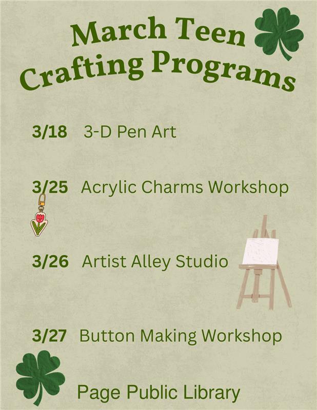 Teen Program - Acrylic Charms Workshop Location Page Public Library 479 S. Lake Powell Blvd., Page AZ, 86040 Date March 25, 2026 Time 4:00 PM to 6:00 PM Department Page Public Library Category Teen's Calendar Description |