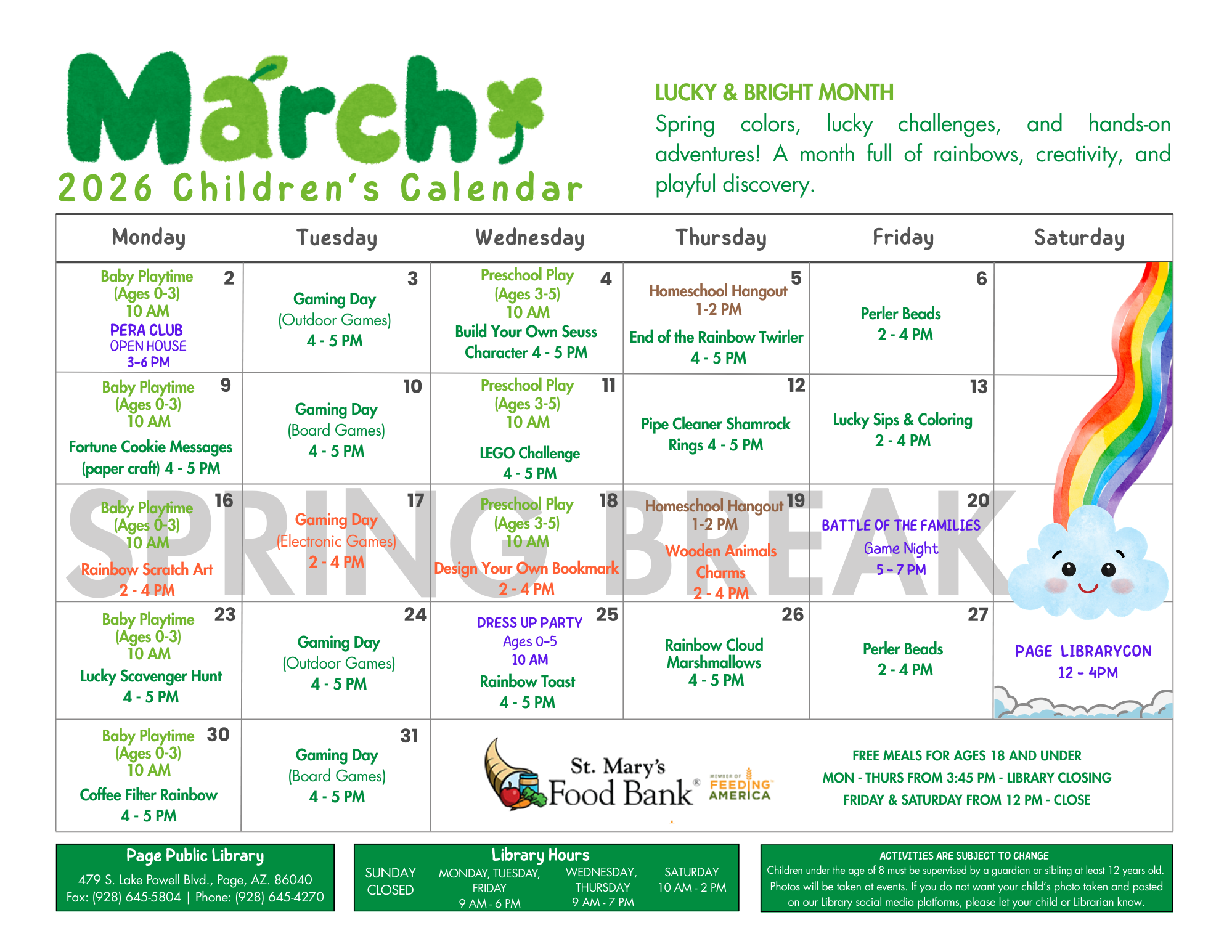 Children's Homeschool Hangout Location Page Public Library 479 S. Lake Powell Blvd., Page AZ, 86040 Date March 05, 2026 Time 1:00 PM to 2:00 PM Department Page Public Library Category Children's Calendar Description |