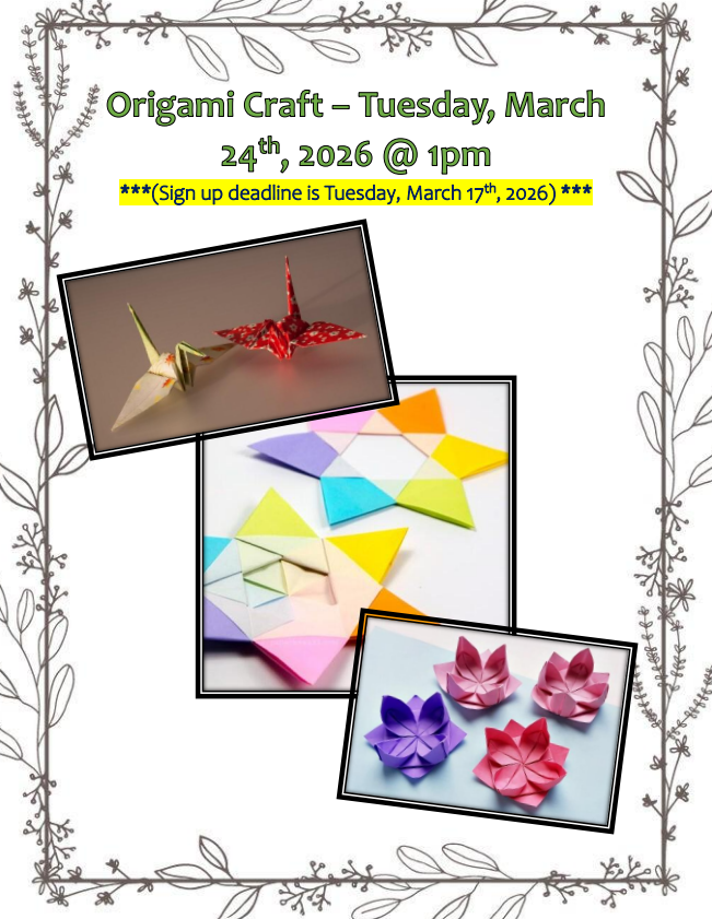 Origami Craft Location Page Community Center 699 S. Navajo Dr., Page AZ, 86040 Date March 24, 2026 Time 1:00 PM to 3:00 PM Department Community Center Category Crafts Description Oh Oh Origami...... Please sign up NO LATER THAN 03.17.2026 to guarantee your space. |