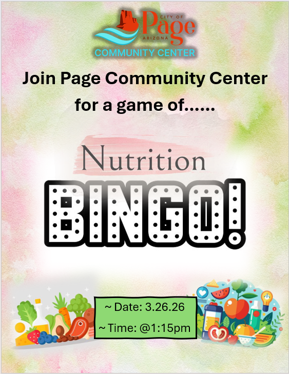 Nutrition Bingo Location Page Community Center 699 S. Navajo Dr., Page AZ, 86040 Date March 26, 2026 Time 1:15 PM to 3:15 PM Department Community Center Category Games Description The more people that play, the more you can win! Join us for a Nutrition themed Bingo and have fun.... We kindly ask that you arrive on time to play. ;) |