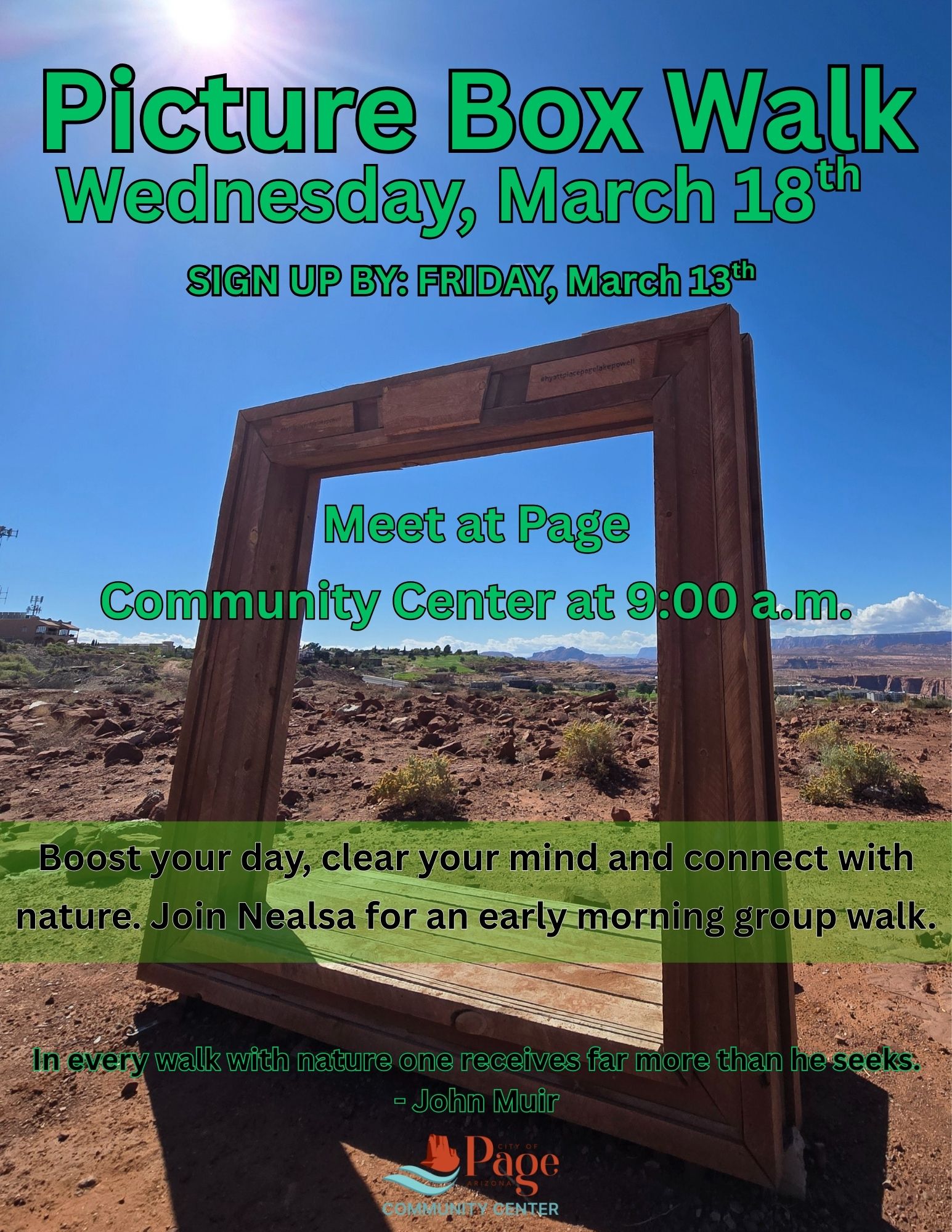 Picture Box Walk About Location Page Community Center 699 S. Navajo Dr., Page AZ, 86040 Date March 18, 2026 Time 9:00 AM to 10:30 AM Department Community Center Category Staying Active Description Sign up and waiver deadline is Friday, 03.13.2026. For more information, please call 1.928.645.2600 and speak to Nealsa. |