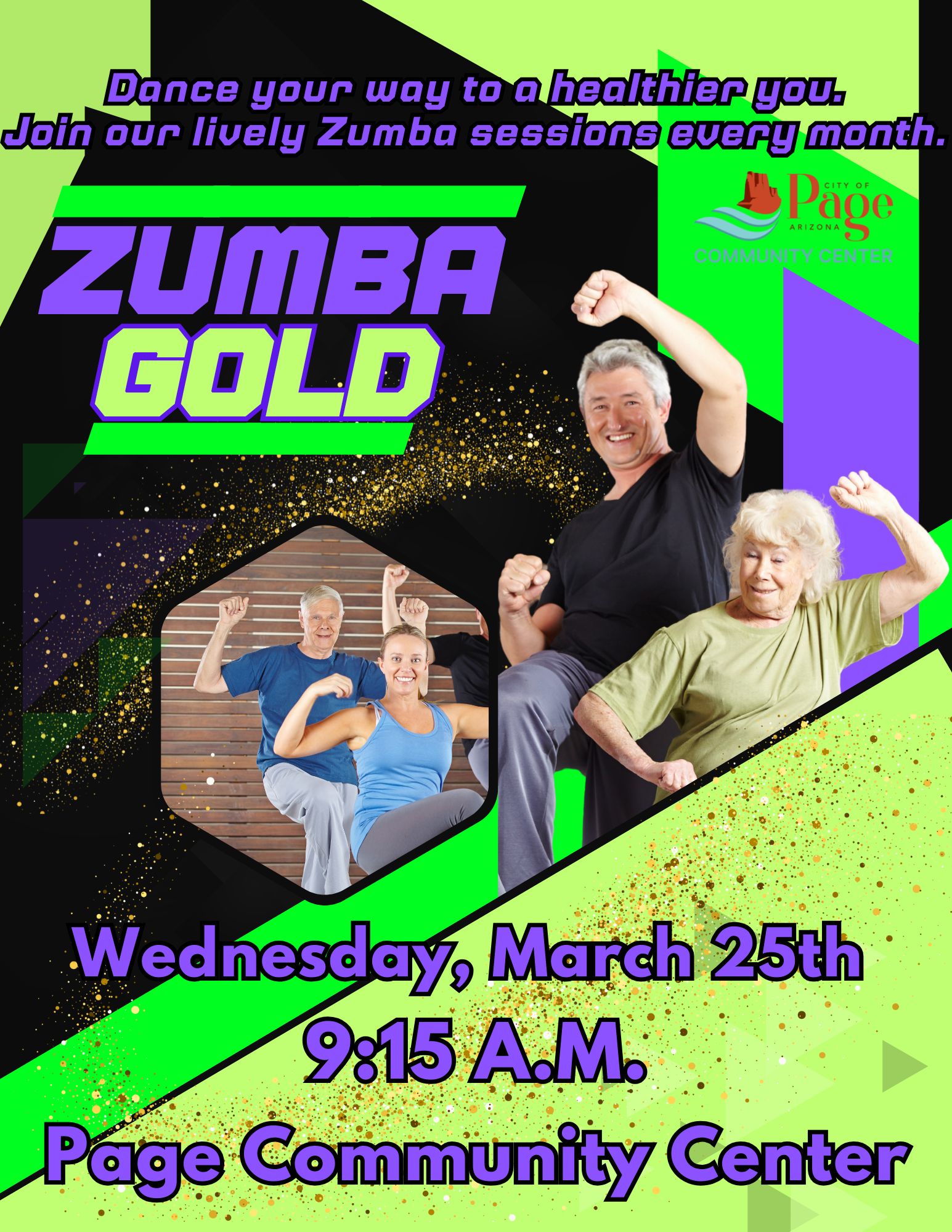 Zumba Gold is Back! Location Page Community Center 699 S. Navajo Dr., Page AZ, 86040 Date March 25, 2026 Time 9:15 AM to 10:30 AM Department Community Center Category Staying Active Description Come see what you have been missing.... Please arrive on time and enjoy a fun excercise with Tara! |