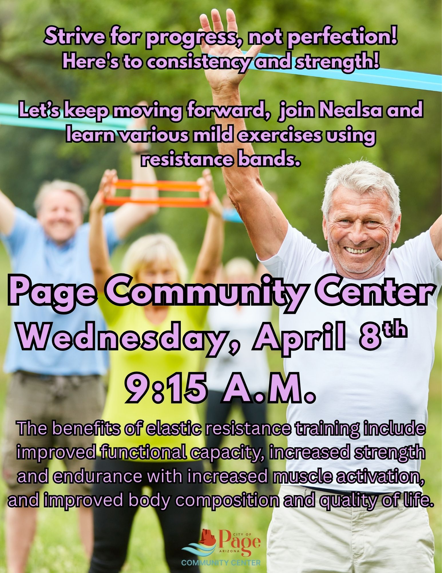 Resistance Band Training Location Page Community Center 699 S. Navajo Dr., Page AZ, 86040 Date April 08, 2026 Time 9:15 AM to 10:45 AM Department Community Center Category Staying Active Description Nealsa will guide you as you learn the importance of resistance band training and the techniques to do it correctly. Late comers will not be allowed in so please make sure you arrive on time to join.... |