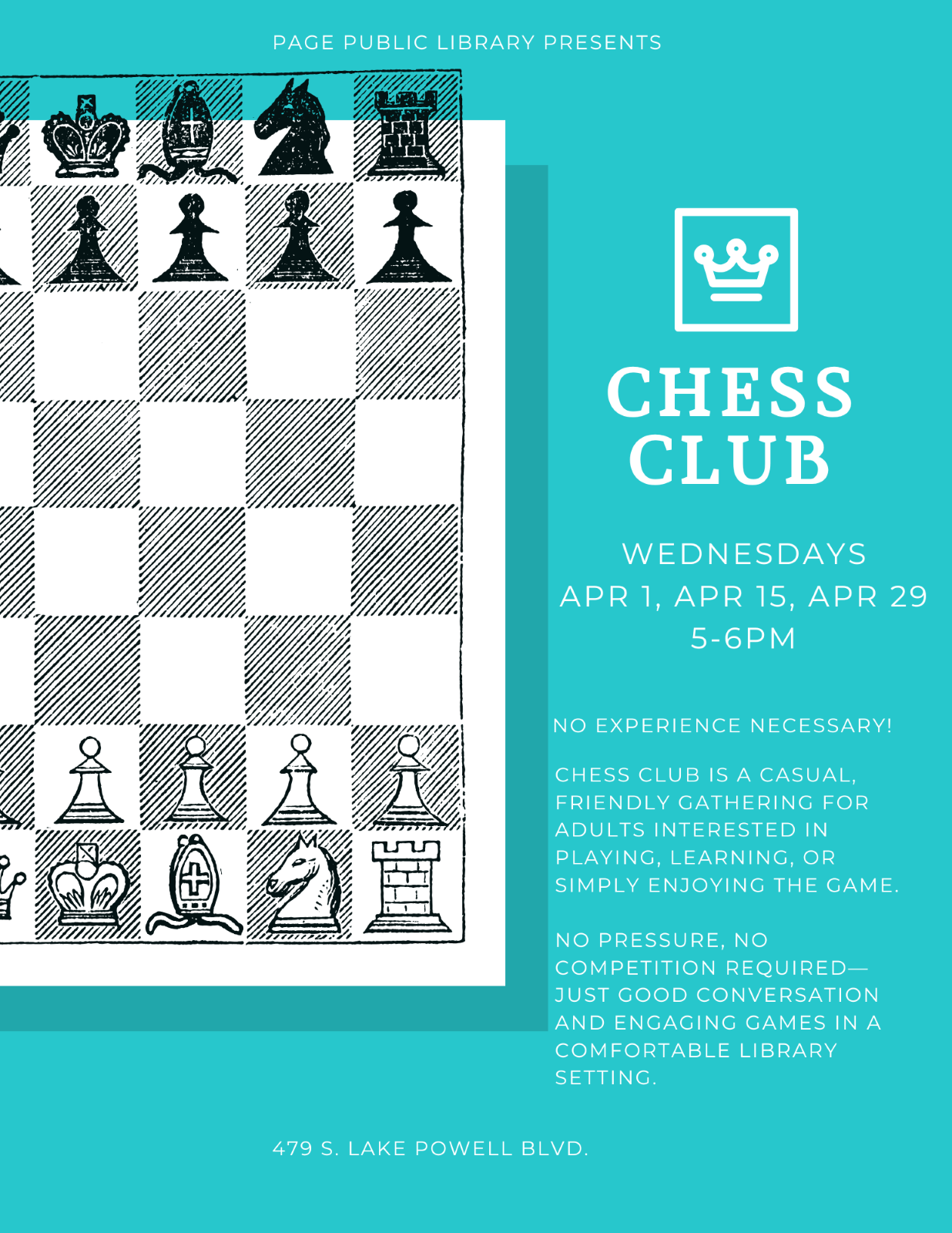 Adult Chess Club Location Page Public Library 479 S. Lake Powell Blvd., Page AZ, 86040 Date April 01, 2026 Time 5:00 PM to 6:00 PM Department Page Public Library Category Adult's Calendar Description |