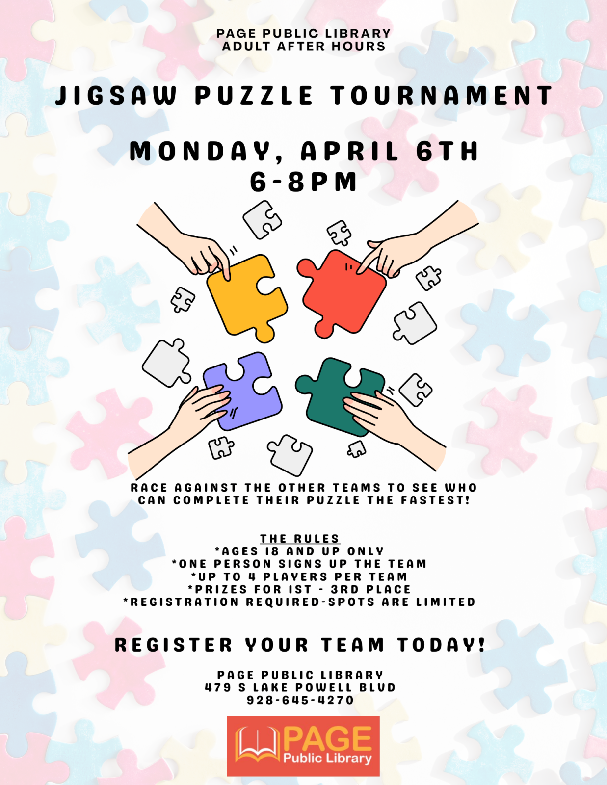 Adult After Hours: Puzzle Tournament Location Page Public Library 479 S. Lake Powell Blvd., Page AZ, 86040 Date April 06, 2026 Time 6:00 PM to 8:00 PM Department Page Public Library Category Adult's Calendar Description |