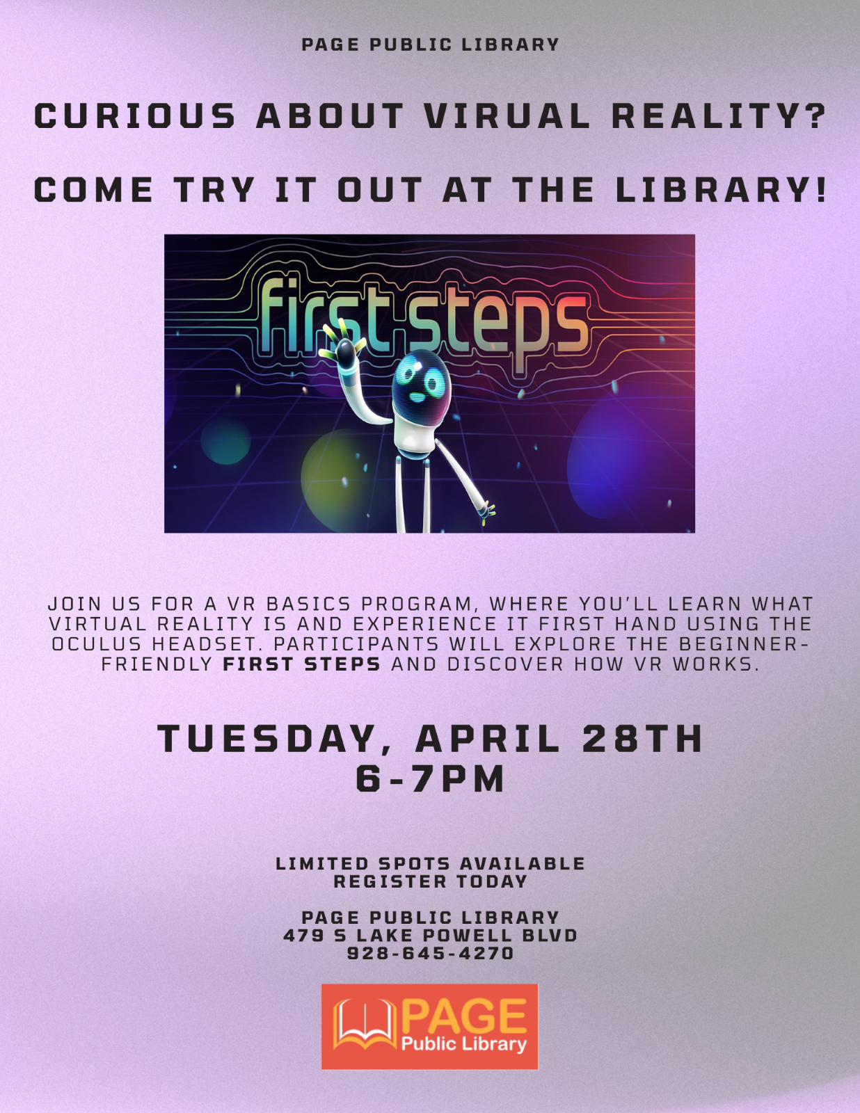 Adult Program - VR Basics Location Page Public Library 479 S. Lake Powell Blvd., Page AZ, 86040 Date April 28, 2026 Time 6:00 PM to 7:00 PM Department Page Public Library Category Adult's Calendar Description |