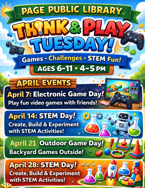 Children's After School Program - STEM Day Location Page Public Library 479 S. Lake Powell Blvd., Page AZ, 86040 Date April 28, 2026 Time 4:00 PM to 5:00 PM Repeat Bi-Weekly Department Page Public Library Category All Ages Welcome Description |