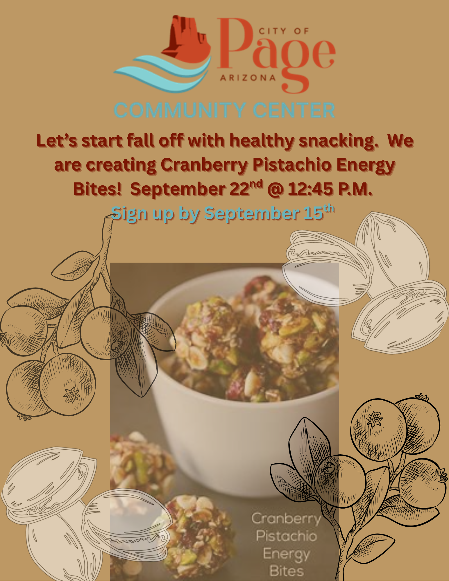 Cranberry Pistachio Energy Bites Location Page Community Center 699 S. Navajo Dr., Page AZ, 86040 Date September 29, 2025 Time 12:45 PM to 1:30 PM Department Community Center Category Healthy Treats Description Get energized by learning how to make Cranberry Pistachio Energy Bites.... You must register BY 09.23.2025 - This event was rescheduled from 09.22.2025 to 09.29.2025 |