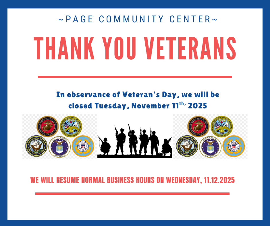 Thank Our Veterans Location Page Community Center 699 S. Navajo Dr., Page AZ, 86040 Date November 11, 2025 Time This is an all day event Department Community Center Category Holidays Description Thank you Veterans.... We will be closed on Tuesday, 11.11/.2025 in observance of Veteran's Day |