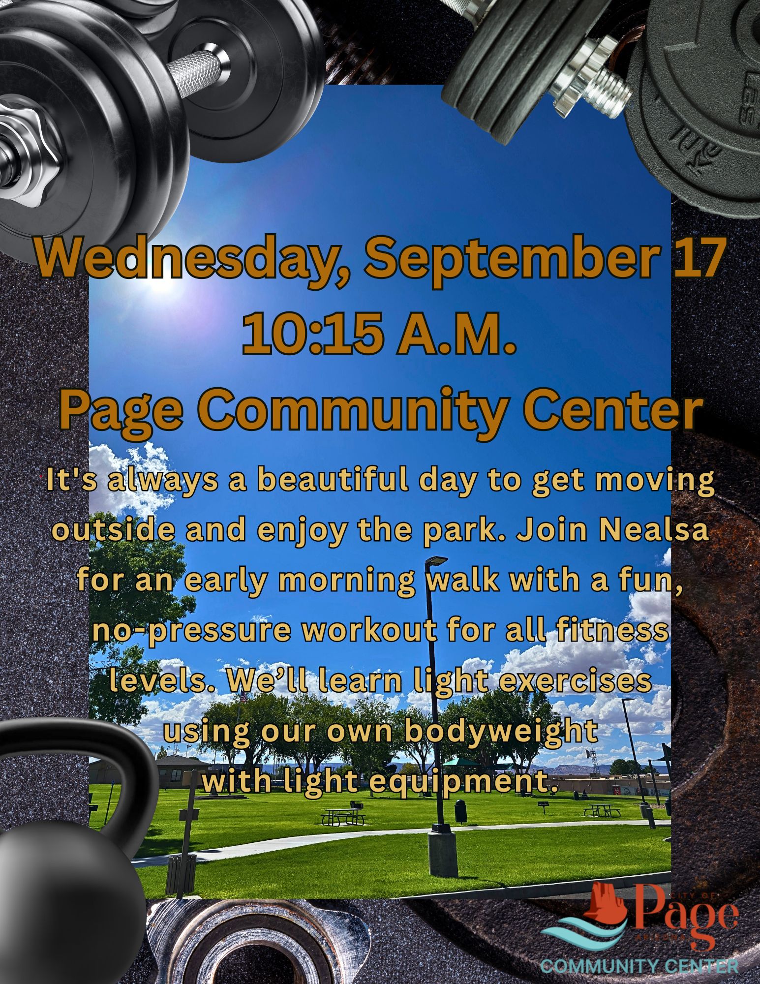 Walk with exercises Location Page Community Center 699 S. Navajo Dr., Page AZ, 86040 Date September 17, 2025 Time 10:15 AM to 11:15 AM Department Community Center Category Staying Active Description Join us for a walk in the park with some light exercises. "Exercise is the key not only to physical health but to peace of mind" N.M |