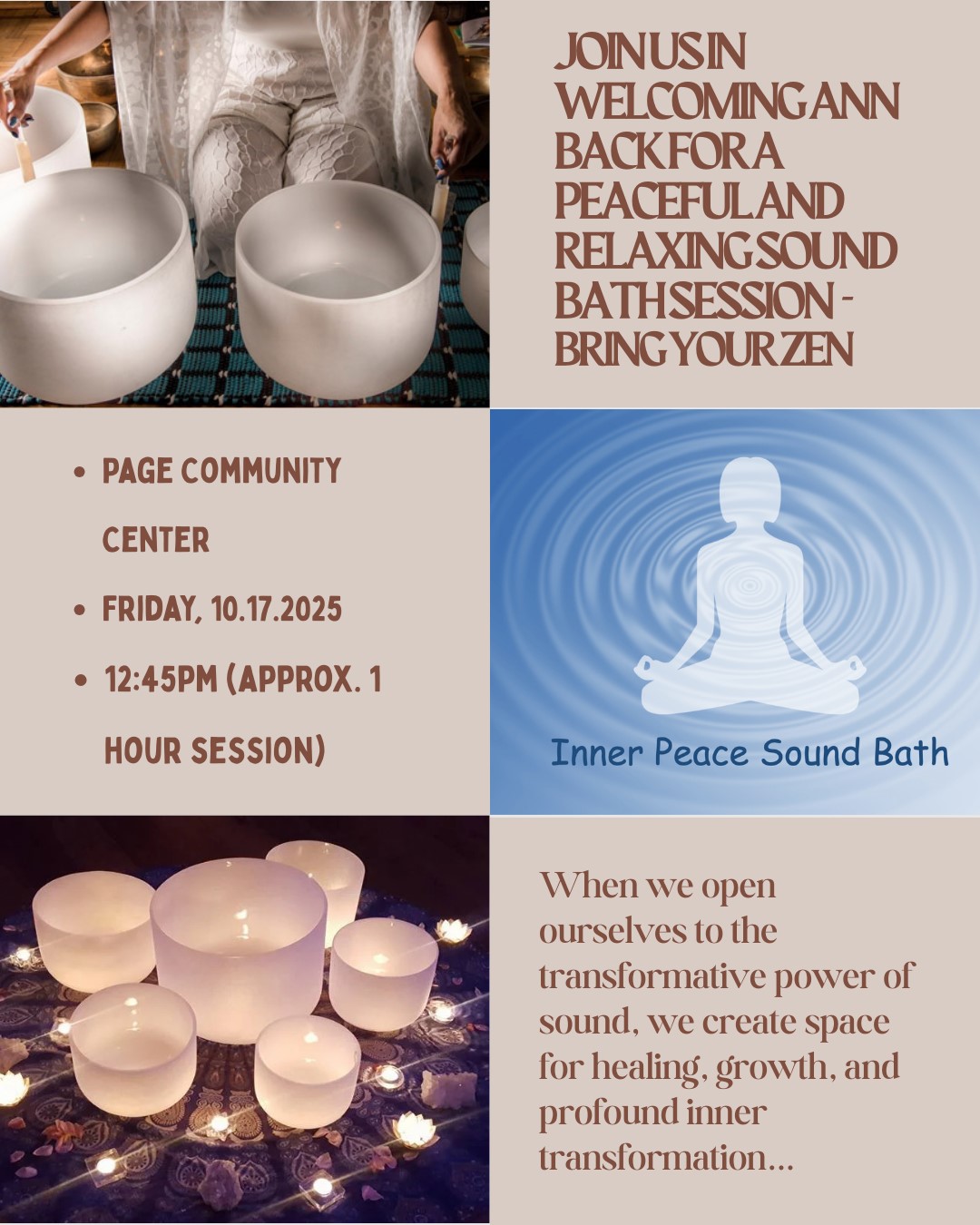 Sound Bath Relaxation Location Page Community Center 699 S. Navajo Dr., Page AZ, 86040 Date October 17, 2025 Time 12:45 PM to 2:00 PM Department Community Center Description The power of sound to integrate and cure... is ancient and primal. Music is part of the universal language of healing. Bring your zen, comfy clothes and we request that you arrive on time and stay for the entire session as to not interupt the healing powers of sound. |
