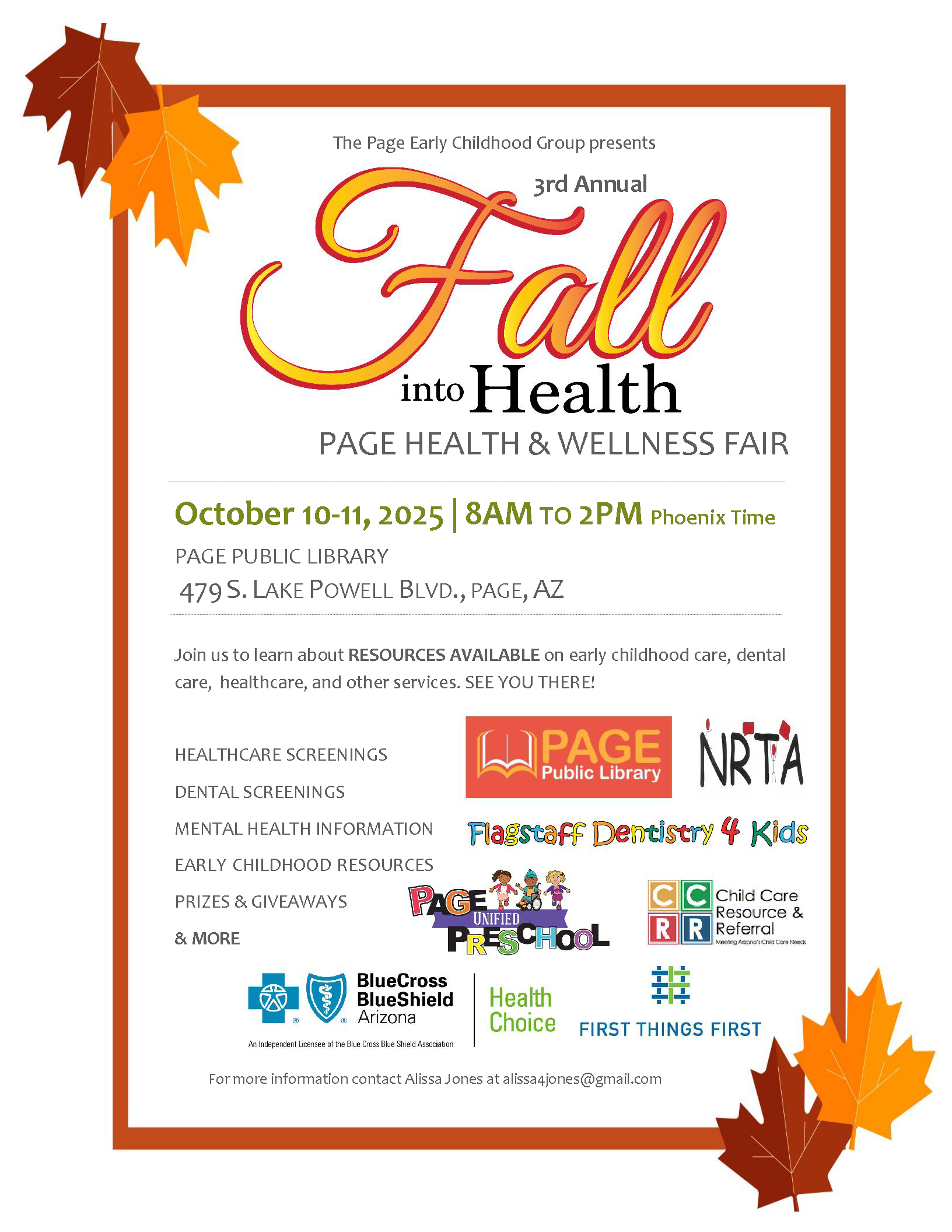 Fall Into Health: Childhood Resource Fair Location Page Public Library 479 S. Lake Powell Blvd., Page AZ, 86040 Date October 10, 2025 Time 8:00 AM to 2:00 PM Department Page Public Library Category All Ages Welcome Description |
