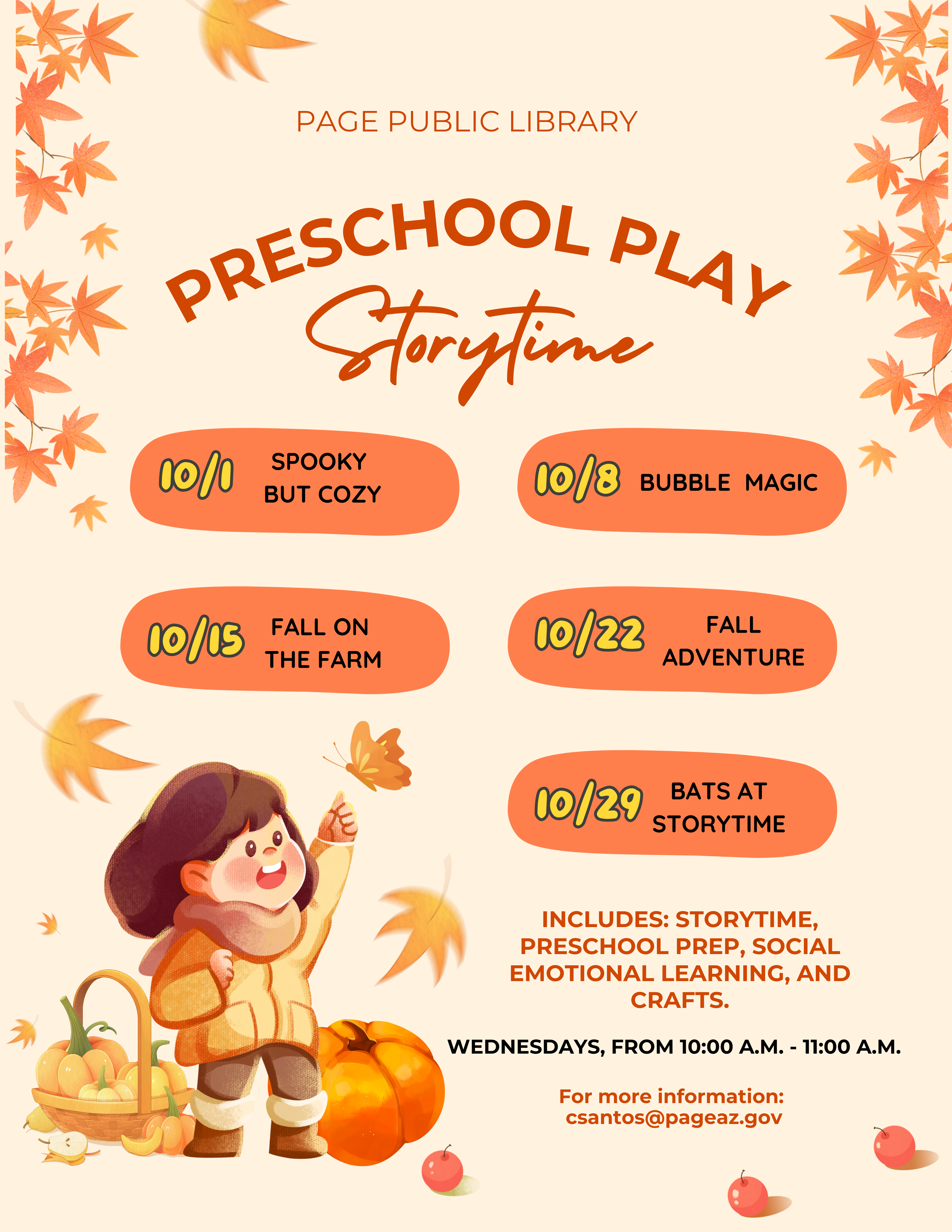 Preschool Play Location Page Public Library 479 S. Lake Powell Blvd., Page AZ, 86040 Date October 22, 2025 Time 10:00 AM to 11:00 AM Repeat Weekly Department Page Public Library Category Children's Calendar Description |