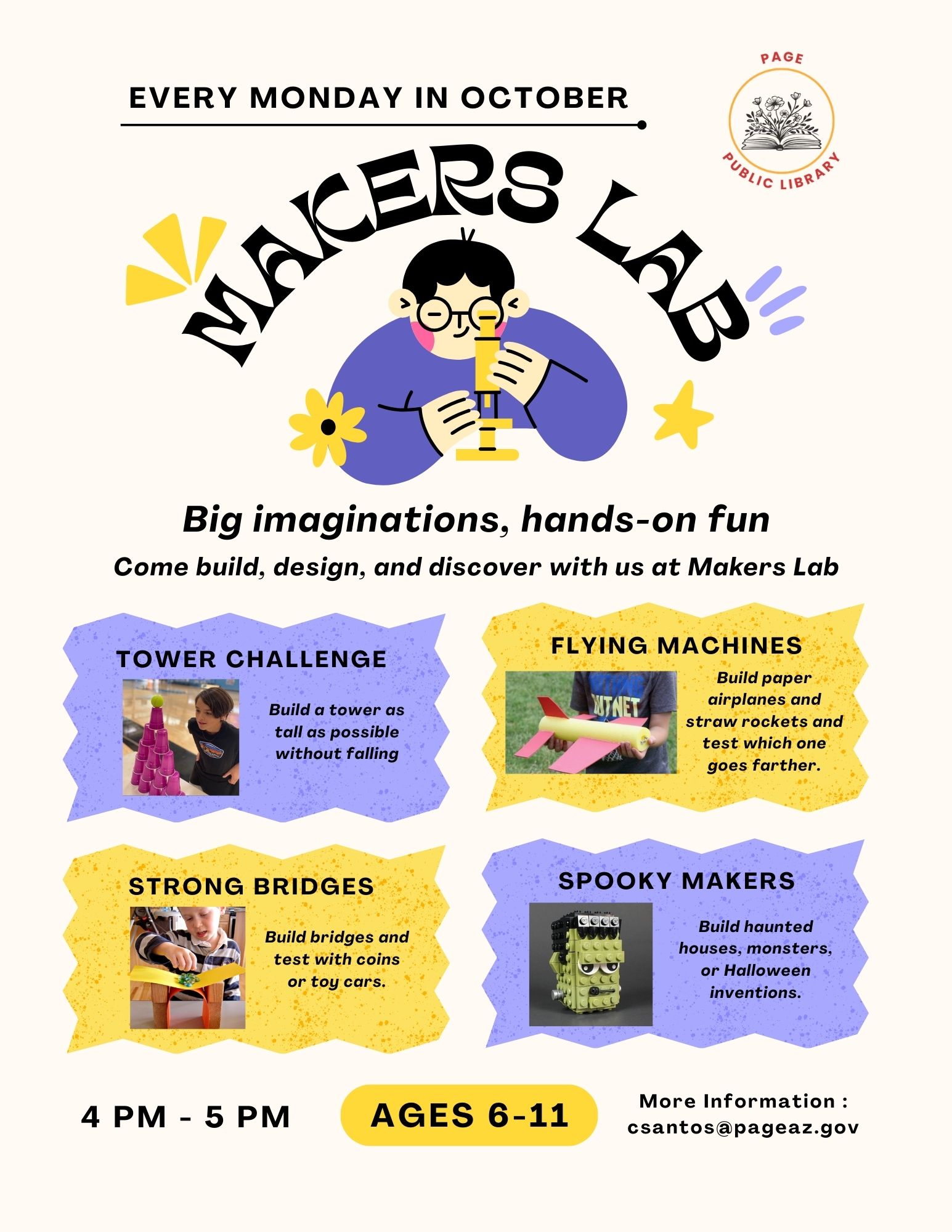 Makers Lab: Tower Challenge Location Page Public Library 479 S. Lake Powell Blvd., Page AZ, 86040 Date October 06, 2025 Time 4:30 PM to 5:30 PM Department Page Public Library Category After School Program Description |
