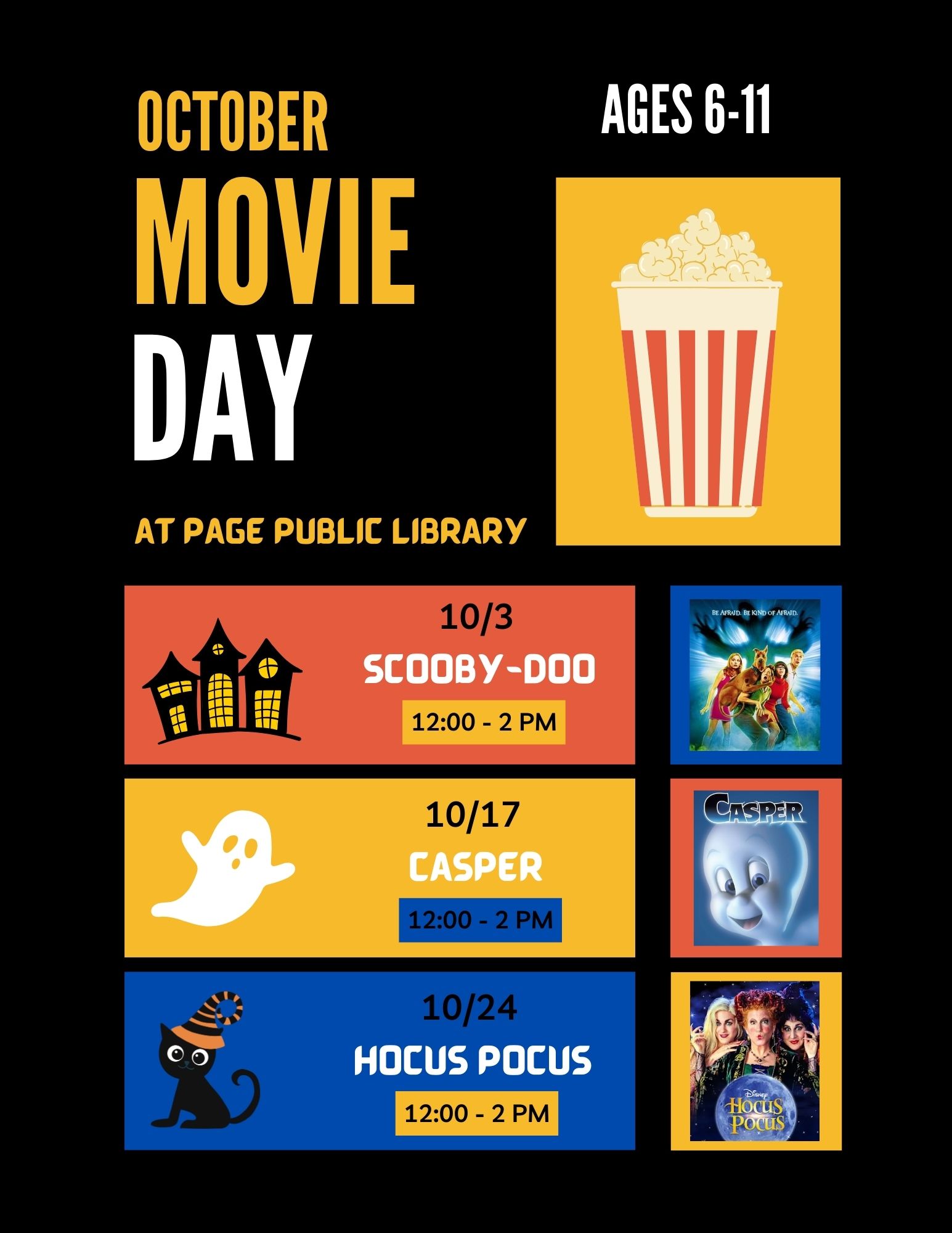Movie Day: Scooby-Doo Location Page Public Library 479 S. Lake Powell Blvd., Page AZ, 86040 Date October 03, 2025 Time 12:00 PM to 2:00 PM Department Page Public Library Category Children's Calendar Description |