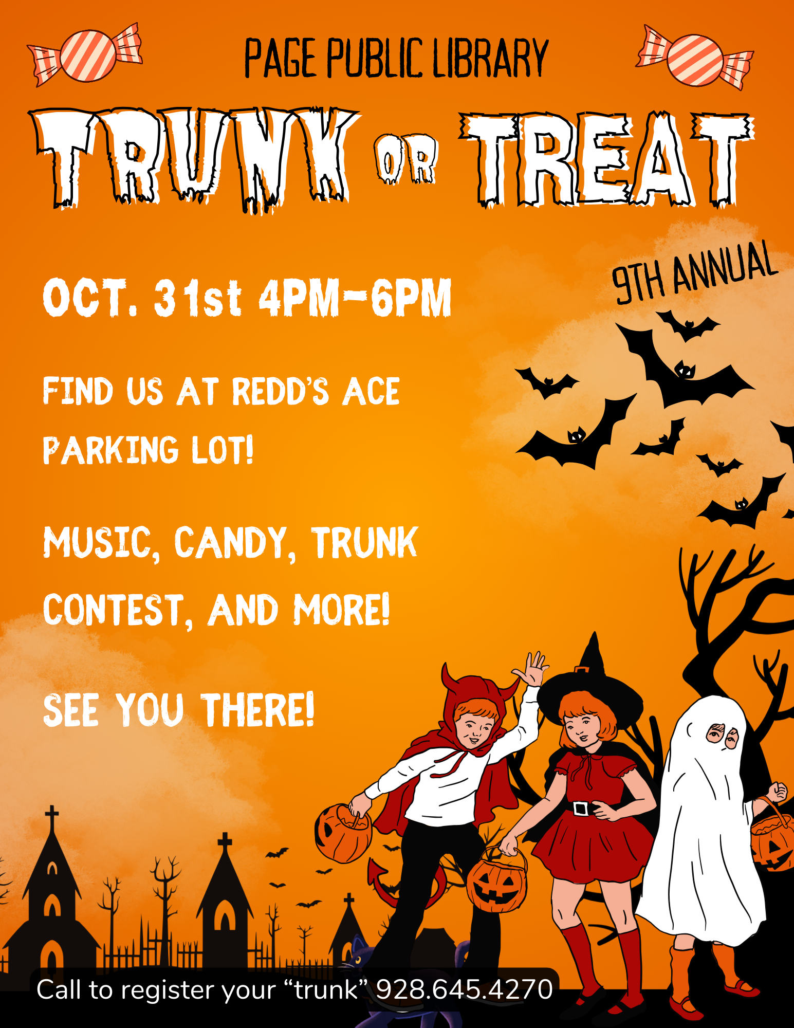 Trunk or Treat Location Redd’s Ace Parking Lot 620 N Navajo Dr, Page AZ, 86040 Date October 31, 2025 Time 4:00 PM to 6:00 PM Department Page Public Library Category All Ages Welcome Description |