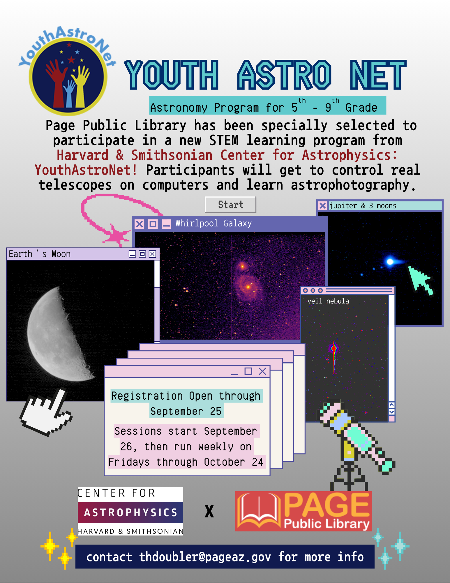Youth AstroNet Project Location Page Public Library 479 S. Lake Powell Blvd., Page AZ, 86040 Date October 17, 2025 Time 2:30 PM to 4:00 PM Repeat Weekly Department Page Public Library Category Teen's Calendar Description |