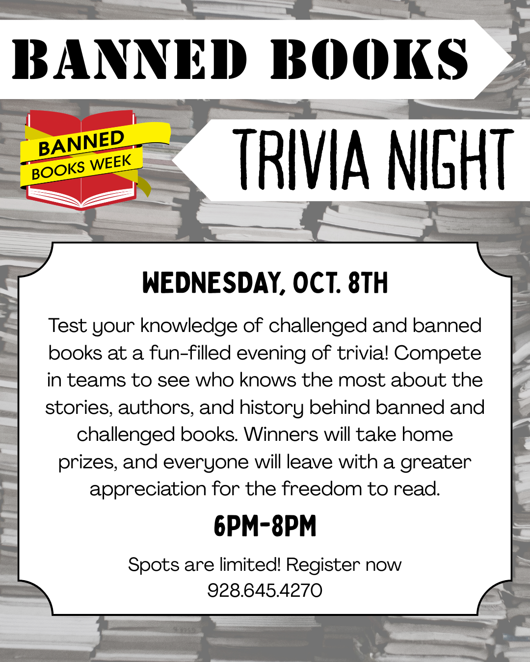 Banned Books Trivia Night Location Page Public Library 479 S. Lake Powell Blvd., Page AZ, 86040 Date October 08, 2025 Time 6:00 PM to 8:00 PM Department Page Public Library Category Adult's Calendar Description Registration is required. |