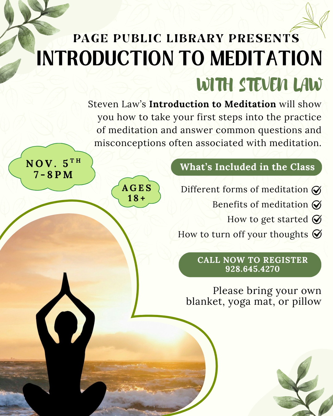 Introduction to Meditation Location Page Public Library 479 S. Lake Powell Blvd., Page AZ, 86040 Date November 05, 2025 Time 7:00 PM to 8:00 PM Department Page Public Library Category Adult's Calendar Description Registration is required.  |