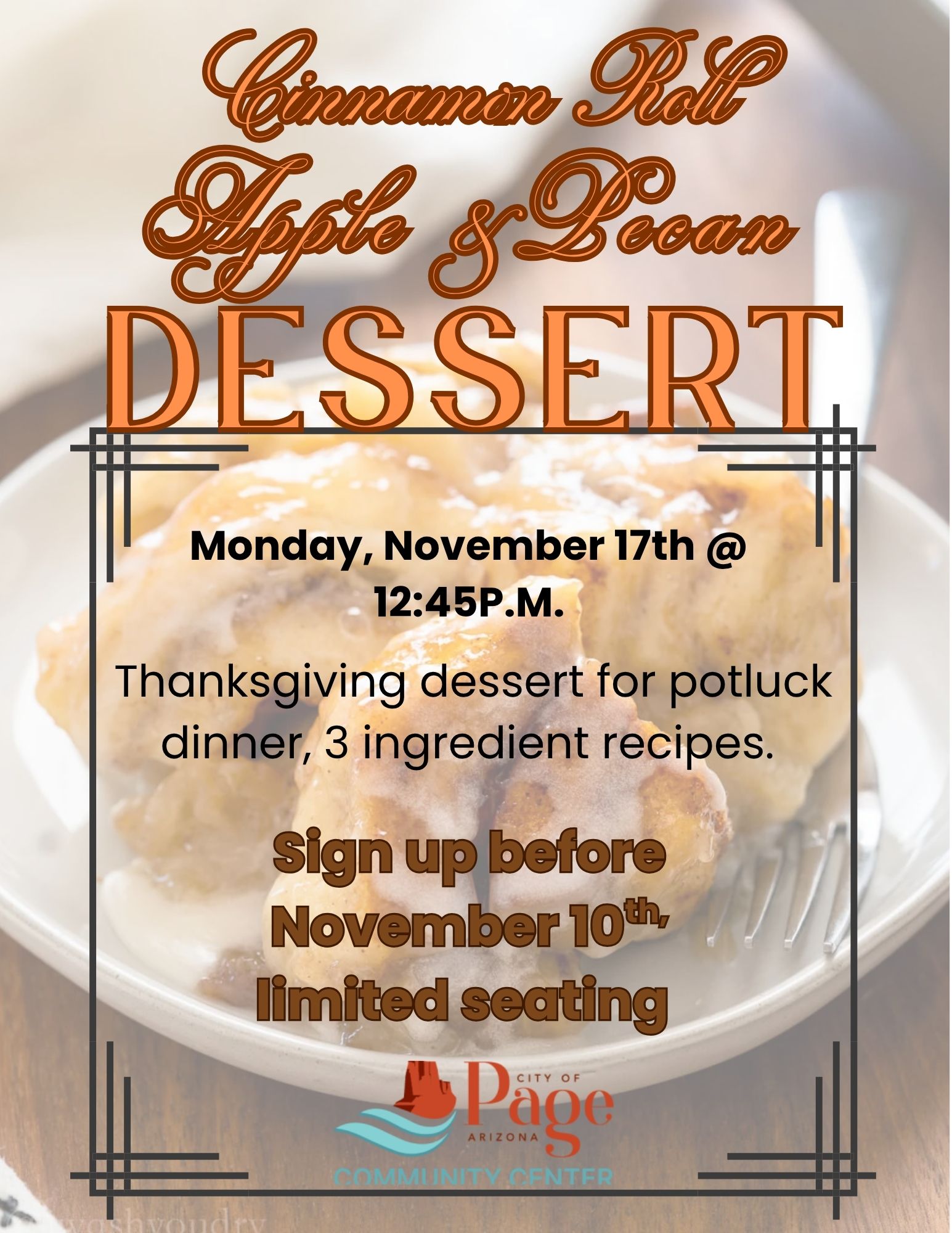 Noanie's 3 ingredient dessert Location Page Community Center 699 S. Navajo Dr., Page AZ, 86040 Date November 17, 2025 Time 12:45 PM to 2:00 PM Department Community Center Category Healthy Treats Description Please reserve your spot to learn Noanie's 3 ingredient dessert. Great for potlucks! :) Deadline to register is Monday, 11.10.2025.  |