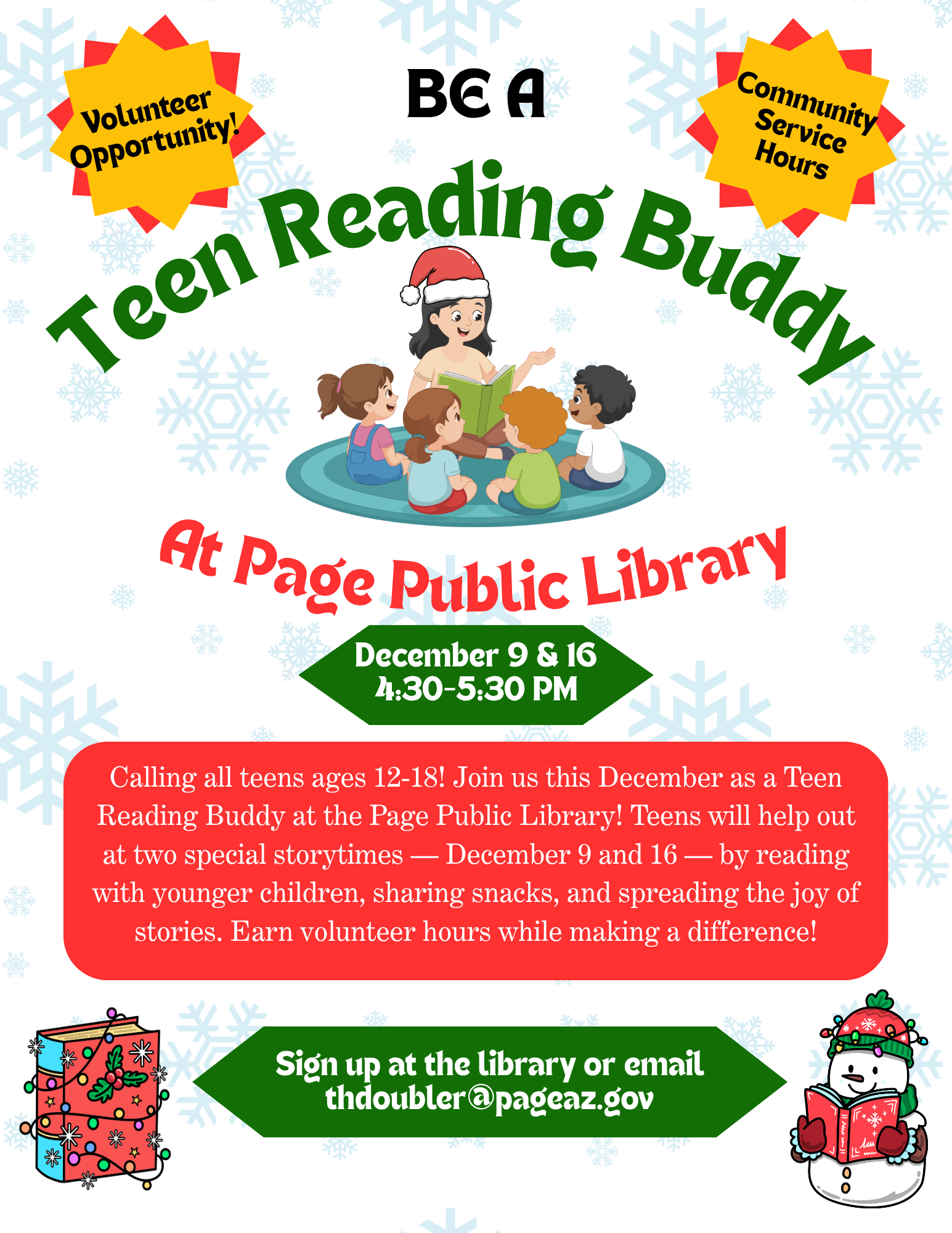 Teen Reading Buddies Location Page Public Library 479 S. Lake Powell Blvd., Page AZ, 86040 Date December 09, 2025 Time 4:30 PM to 5:30 PM Department Page Public Library Category Teen's Calendar Description Sign up at the library, or email thdoubler@pageaz.gov to register for this volunteer opportunity. |